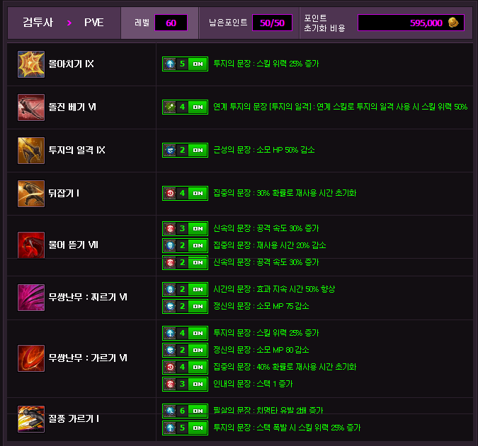 현재 제 딜투 문장 세팅입니다 전체적으로 무조건적인 뎀증만 해놓았고 뒤잡기 쿨초기같은 경우는 뒤잡기도 어느정도 회피기로 쓰기때문에 저같은 경운 초기화를 해둔 상태입니다