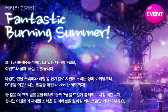 안녕하세요. Mr. 블루 입니다. 여러분께 한 여름의 열기를 더 뜨겁게 달구어 줄 테라의 반가운 소식을 전해 드리고자 오랜만에 블루의 편지로 찾아 뵙게 되었습니다. ‘비밀’이라 이름 붙은 이 편지의 핵심 포인트는, ‘테라의 여름 업데이트’ 입니다. 사냥터 퀘스트 보상과 아이템 드랍 확률 증가는 물론, 쉬워지는 난이도로 달라질 테라의 모습을 꼭꼭 눌러 담은 블루의 비밀 편지! 지금부터 함께 열어보도록 하겠습니다.
