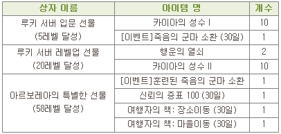 ▣ 서버 혜택 • 루키 서버에서는 경험치 100% 증가 버프가 항시 적용됩니다. • 루키서버에서 58레벨 달성 시 홈페이지 부가서비의 무료 이전을 통해 서버이전이 가능합니다. • 루키 서버 달성 레벨에 따라 아래 선물 상자가 지급됩니다.