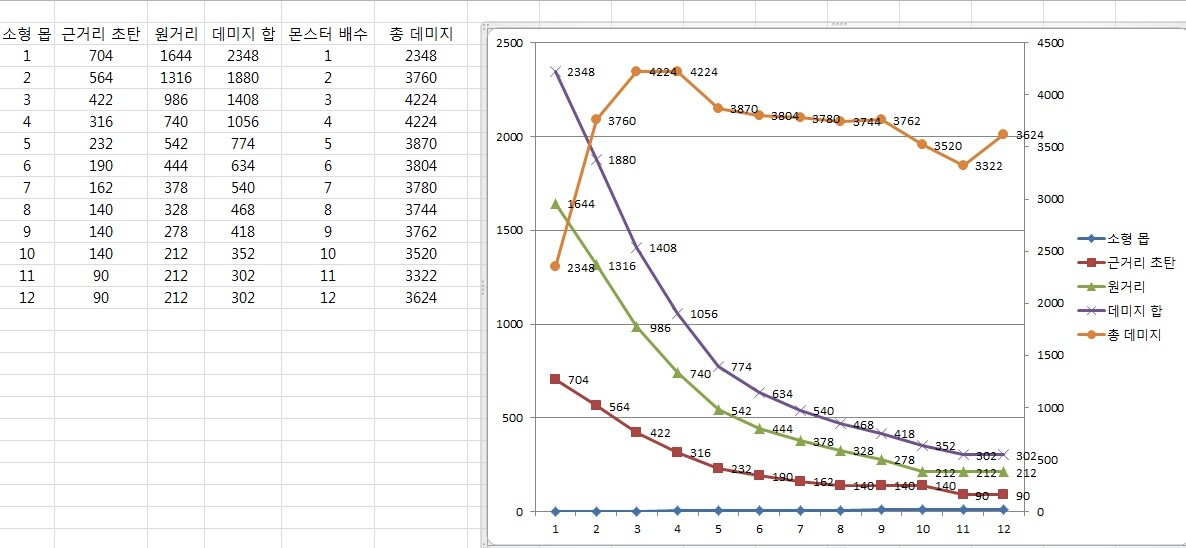 이제 어느 정도 그래프가 만들어졌습니다. 데미지 합은 개개별 몬스터에게 들어가는 데미지를, 총 데미지는 전체 몬스터에게 들어간 데미지의 총량입니다. 역시나 알려진 대로 3기~4기 가량의 몬스터에게 들어가는 데미지가 가장 큽니다. 1~2기 정도의 몰려다니는 몬스터보다는 최대 4기까지 몰아서 광역을 날리는게 데미지 효율이 가장 큰 셈입니다.
