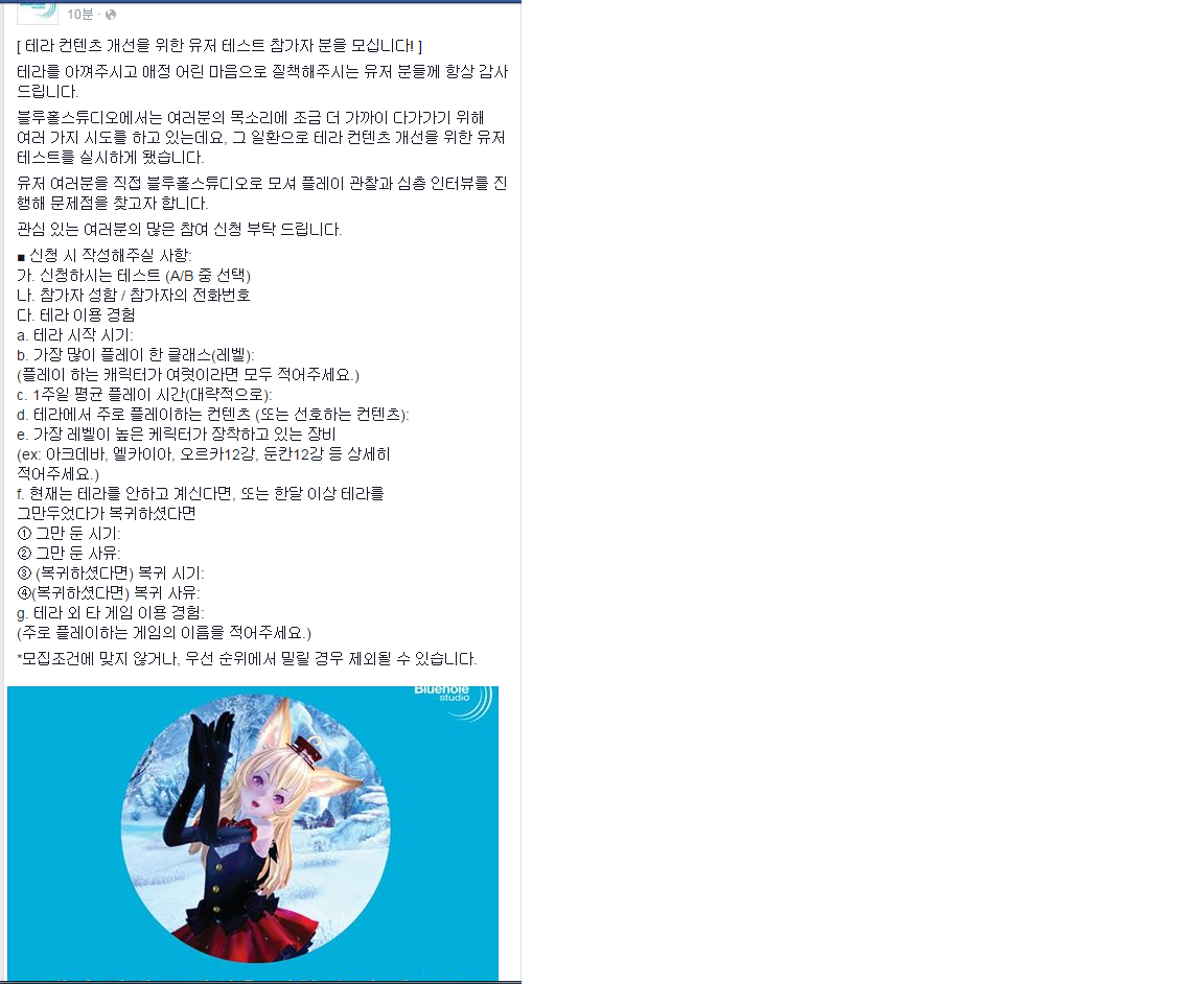테라 유저 테스트 선발(페북)![]() 유저간담회때는 그냥 그러해서 딱히 관심없었지만 테라에 애정 붓고 있는지금은 관심가네요 ㅎㅎ 개념충만하신분들의 좋은 피드백이 나오면 좋겠네요 자세한 사항은 밑에 댓글링크에 있는 블루홀 페북사이트 참조하시면 잘 나와 있어요~