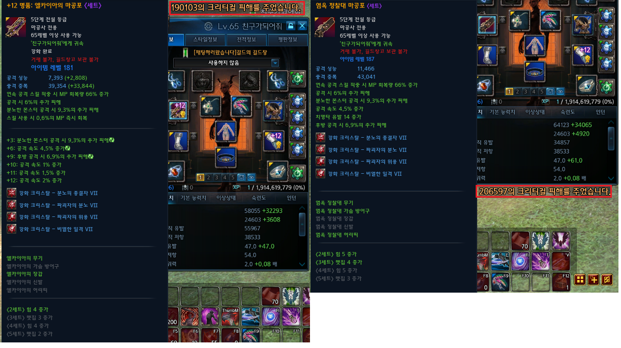 장비를 교체하면서 염옥이 엘카의 세트옵션인 힘 4가 빠져서 그만큼 대미지 손실을 본걸 감안하더라도 엘카12강이 극옵이라면 파티플레이 기준 후방에서 분노한 보스몹까지 생각하면 오히려 엘카쪽이 조금더 나은 성능이 되버림