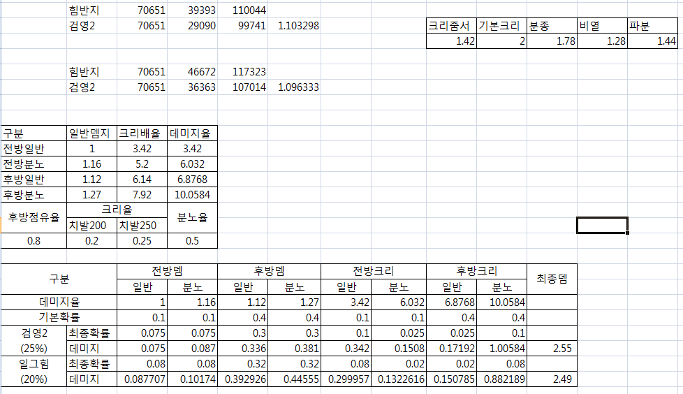 4. 위 가정시 최종 데미지율 ![]() 보시는 바와 같이 크리율에서 5%p 차이가 난다면 최종데미지율이 검영2가 더 좋습니다. 물론 치명타유발 수치가 정확히 얼마나 영향을 미치는지 알 수 없지만 체감으로는 최소 저정도 이상은 나는거 같네요 동일한 조건에서 후방점유율 정보를 10%에서 90%까지 바꾸더라도 모든 경우에서 검영2악세가 우세합니다. 동일한 조건에서 분노율을 조정하면 10%에서 80%까지는 검영2가 우세하나 그 이상넘어가는 순간 일그힘악세의 총데미지율이 더 좋게 나옵니다. 5. 치명타유발과 치명타 확률에 관한 실험 과연 치명타 유발과 치명타 확률이 얼마나 영향을 미치는지 간접적으로 알기 위해서 PVP를 통해서 실험해 보았습니다. 실험조건은 치명타 저항이 143인 궁수를 대상으로 후방으로 평타 200대씩 때려서 어느정도 크리가 터지는지 실험해 보았습니다. 치유발 210일 경우 총 공격횟수 200, 치명타발생 67회 치명타확률 33.5% 치유발 250일 경우 총 공격횟수 200, 치명타 발생 99회 치명타확률 49.5% 법사라서 그런지 몹때릴때 보다 치명타가 더 터지는 듯한 느낌이 들긴하였지만 분명히 치유발 수치의 차이가 어마어마한 치명타확률차이를 만들어 내고 있습니다. 기존 실험에서도 추정하기를 치명타 확률은 치명타유발 / 치명타저항 이 아니라 (치명타유발-치명타저항) * 기본치명타율 로 산정되는거로 보였는데.. 이번 실험에서도 비슷한 결과를 내고 있는 것으로 보입니다. 6. 결론 저는 비록 일그악세 4셋에 옵리 120장까지 발라가면서 악세를 다 맞췄지만 기존 검영2악세에 비해서 오히려 효율이 떨어지는 것으로 보입니다. 마공사의 경우는 조금 다른 문제지만 검영2있는 다른 딜러직군들은 힘악세 가지말고 치명악세만 맞추시는게 효율이 좋다고 봅니다.
