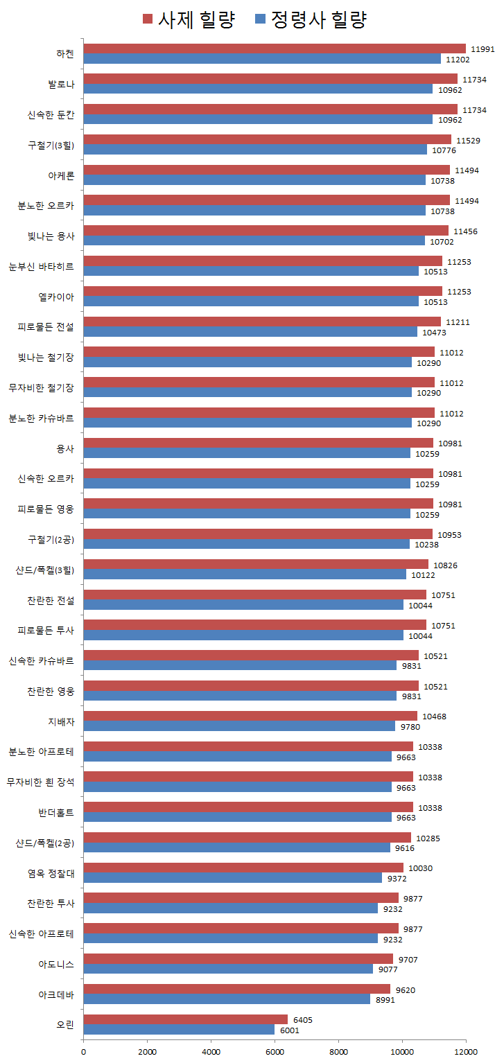 힐러 무기 비교힐량은 지팡이, 글러브, 악세의 힐옵을 포함하여 계산했습니다. 기준장비는 1. 시공 회복 악세 5셋 2. 힐옵이 붙은 발로나 화글 3. 최상옵 (가능할 경우)12강 무기 이며, 더 이상의 힐량 증가 옵션은 없다고 가정합니다. 1. 힐량 비교 ![]() 2. 공속 비교 ![]() 3. 재감비교 ![]() 개인적으로 빛용 지팡이가 제일 좋은 거 같고, 빛철 지팡이는 아직도 쓸만합니다.