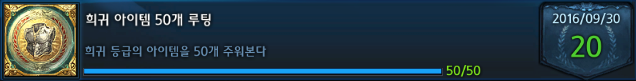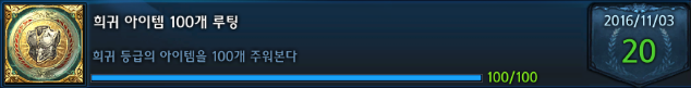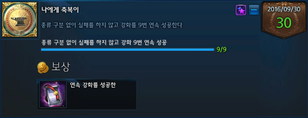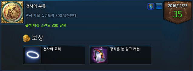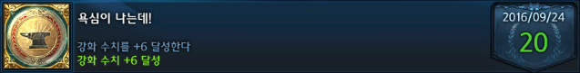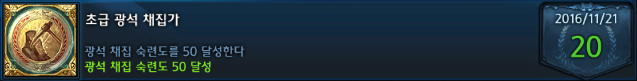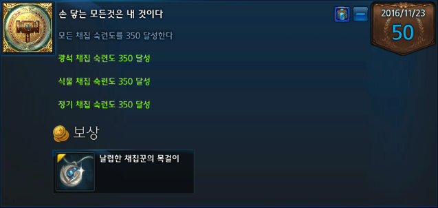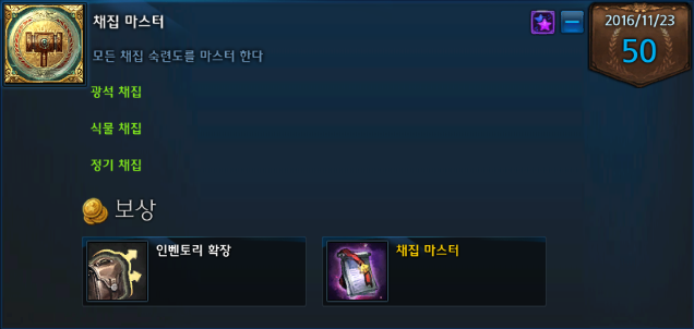생활 업적 가이드생활 업적 가이드 강화 채집 친구와 파티 아이템 미분류 ※ 업적 검색 방법 Ctrl + F 원하는 단어 검색 첫 강화 성공 ![]() 여기까지 안전한가? ![]() 욕심이 나는데! ![]() 조금만.. 조금만 더.. ![]() 업적 보상: 강화를 멈출 수 없는 칭호 오~ 마이! 갓! ![]() 나에게 축복이 ![]() 업적 보상: 연속 강화를 성공한 칭호 강철 심장 ![]() ※ 업적 검색 방법 Ctrl + F 원하는 단어 검색 광석 채집의 시작 ![]() 초급 광석 채집가 ![]() 중급 광석 채집가 ![]() 천사의 부름 ![]() 업적 보상: 천사의 고리, 광석은 눈 감고 캐는 칭호 땡깡땡깡 신나는 채광 ![]() 정기 채집의 시작 ![]() 초급 정기 채집가 ![]() 중급 정기 채집가 ![]() 요정의 축복 ![]() 업적 보상: 요정의 구슬. 정기는 눈 감고 캐는 칭호 슈우우웅 정기 흡슈웅 ![]() 식물 채집의 시작 ![]() 초급 식물 채집가 ![]() 중급 식물 채집가 ![]() 클로버의 친구 ![]() 업적 보상: 해바라기 밴드, 식물은 눈 감고 캐는 칭호 쓱싹쓱싹 식물 싹쓸이 ![]() 그냥 지나칠 수 없어! ![]() 업적 보상: 채집 숙련도 증가 채집 마스터 ![]() 업적 보상: 인벤토리 확장, 채집 마스터 칭호 손 닿는 모든것은 내 것이다 ![]() 업적 보상: 날렵한 채집꾼의 목걸이 채집 ![]() ↑ 1. 0~100 정기, 식물 채집 ↑ 1. 100~200 광석 채집 2. 0~100 광석 채집 2. 100~200 정기 채집 3. 100~200 식물 채집 ↑ 1. 200~350 광석, 정기, 식물 채집 ※ 업적 검색 방법 Ctrl + F 원하는 단어 검색 새로운 파티장 ![]() 신임가는 파티장 ![]() 나를 따르라! ![]() 업적 보상: 숙련된 파티장 칭호 신참 파티원 ![]() 능숙한 파티원 ![]() 맡겨만 주십시오 ![]() 업적 보상: 숙련된 파티원 칭호 외롭지는 않구나 ![]() 훌륭한 대인관계 ![]() 우리는 모두 친구 ![]() 업적 보상: 문어발 칭호 우리 함께 해요 ![]() 업적 보상: 파티 구합니다 칭호 함께하는 즐거움 ![]() 던전 용병대 ![]() 업적 보상: 다운된 상태에서 피격 시 데미지 감소 ※ 업적 검색 방법 Ctrl + F 원하는 단어 검색 고급 아이템 최초 루팅 ![]() 고급 아이템 50개 루팅 ![]() 고급 아이템 100개 루팅 ![]() 고급 아이템 500개 루팅 ![]() 희귀 아이템 최초 루팅 ![]() 희귀 아이템 50개 루팅 ![]() 희귀 아이템 100개 루팅 ![]() 희귀 아이템 300개 루팅 ![]() 전설 아이템 최초 루팅 ![]() 전설 아이템 10개 루팅 ![]() 전설 아이템 50개 루팅 ![]() 전설 아이템 100개 루팅 ![]() 전설의 땅거지 ![]() 업적 보상: 스킬교본: 카미르의 신기루 소환 21일 기간제 일단 줍고 보자 ![]() 줍는게 임자 ![]() 땅에 있는 것은 다 내꺼 ![]() 아직은 부족한 재산 ![]() 중산층으로 도약 ![]() 채워지지 않는 돈 욕심 ![]() 이제 애인만 있으면... ![]() 업적 보상: 대부옹 칭호 나는 아직도 배가 고프다 ![]() 좀 더 빠른 것을 원해 ![]() 업적 보상: 스피드 광 칭호 HP 포션 입문자 ![]() HP 포션 애용자 ![]() HP 포션 중독자 ![]() MP 포션 입문자 ![]() MP 포션 애용자 ![]() MP 포션 중독자 ![]() 업적 보상: 10골드 포션 없이는 못 살아!!! ![]() 업적 보상: 최대 HP 증가 1더하기 1은? ![]() 이수정이냐 저수정이냐 ![]() 눈만 높아졌나봐 ![]() 업적 보상: 크리스탈 원석VII 1개 전설의 무기 ![]() 터질듯한 가방 ![]() ※ 업적 검색 방법 Ctrl + F 원하는 단어 검색 생활에 능통한 자 ![]() 업적 보상: 스킬교본: 후카 요리사 바바 소환 팁: 생활 > 아이템> 나는 아직도 배가 고프다 생활 > 강화 > 오~ 마이! 갓! |