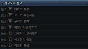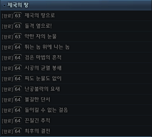 미션 퀘스트 업적 가이드미션 퀘스트 업적 가이드 완료 미션 목록 벨리카 미션 전문가 알레만시아 미션 전문가 카이아도르 미션 전문가 끝나지 않은 추적 ※ 업적 검색 방법 Ctrl + F 원하는 단어 검색 벨리카 미션 전문가: 완료한 미션 티아라니아 [12/12] 발키온의 부름 [8/8] ![]() 사교도의 음모 [7/7] 광기의 전염병 [5/5] ![]() 숨겨진 위협 [7/7] 포포리 왕국에서 [2/4] ![]() 사마엘의 망령 [5/5] ![]() 알레만시아 미션 전문가: 완료한 미션 알레만시아 [2/2] 신들의 흔적 [3/3] ![]() 카이둔 [3/3] 사령관의 분노 [7/7] ![]() 거친 정글로 [1/2] 케스타니카 [3/3] ![]() 카이아도르 미션 전문가: 완료한 미션 카이아도르의 위기 [4/4] 파멸의 마수 [7/7] ![]() 태양의 정원 [5/5] 아르곤 전쟁 [4/5] ![]() 전쟁의 포화 [6/6] ![]() 끝나지 않은 추적: 완료한 미션 엘카이아호 승강장 [7/7] 원시의 땅 [7/7] ![]() 바라카니아 구릉지 [12/12] 고대 바라카 유적터 [18/18] ![]() 제국의 땅 [12/12] 발키온 연합 지원 [10/10] ![]() ※ 업적 검색 방법 Ctrl + F 원하는 단어 검색 수호자로 산다는 것 ![]() 미션 퀘스트: 수호자의 일상 ![]() ![]() ↑ npc 위치 ↑ 그렌 호크 우는 아이 달래기 ![]() 미션 퀘스트: 티아란 나무의 아이들 ![]() ![]() ↑ npc 위치 ↑ 그렌 호크 아르곤 포식자를 쓰러뜨리다! ![]() 업적 보상: 티아라니아 수호자 칭호 미션 퀘스트: 티아란 나무의 눈물 ![]() ![]() ↑ 출입문 위치 ↑ 티아란 나무 출입문 위조된 신분증을 얻다 ![]() 업적 보상: 비밀이 많은 칭호 미션 퀘스트: 대륙으로 ![]() ![]() ↑ npc 위치 ↑ 왈더 그레이 신고식 ![]() 업적 보상: 하사관 칭호 미션 퀘스트: 발키온 연합 사령부 ![]() ![]() ↑ npc 위치 ↑ 게티 잊혀진 자들 ![]() 업적 보상: 데바 정복자 칭호 미션 퀘스트: 데바 수뇌부 토벌 ![]() ![]() ↑ npc 위치 ↑ 센트린 크린 포효를 비명으로 ![]() 업적 보상: 쿠차트 정복자 칭호 미션 퀘스트: 데바의 배후 ![]() ![]() ↑ npc 위치 ↑ 카미아 진급 시험 통과! ![]() 업적 보상: 장교 칭호 미션 퀘스트: 적절한 포상 ![]() ![]() ↑ npc 위치 ↑ 켈림 화이트리버 밤피르 저택의 불청객 ![]() 업적 보상: 밤피르 정복자 칭호 미션 퀘스트: 밤피르 저택 토벌 ![]() ![]() ↑ npc 위치 ↑ 쟈넬라 새로운 친구 ![]() 업적 보상: 엘리온의 동료 칭호 미션 퀘스트: 새로운 음모 ![]() ![]() ↑ npc 위치 ↑ 제퍼스 레논 가면을 벗기다! ![]() 업적 보상: 벨리카의 구원자 칭호 미션 퀘스트: 배신자의 최후 ![]() ![]() ↑ npc 위치 ↑ 베를리아스 백마 탄 왕자님? ![]() 업적 보상: 호위 기사 칭호 미션 퀘스트: 고양이 목에 방울 달기 ![]() ![]() ↑ npc 위치 ↑ 아린 엘린 사교도의 음모를 부수다 ![]() 업적 보상: 아룬의 수호자 칭호 미션 퀘스트: 영예로운 귀환 ![]() ![]() ↑ npc 위치 ↑ 숀 베일리스 벨리카 미션 전문가 ![]() ※ 업적 검색 방법 Ctrl + F 원하는 단어 검색 사막의 꽃, 알레만시아 ![]() 업적 보상: 알레만시아의 귀빈 칭호 미션 퀘스트: 마법의 도시로 ![]() ![]() ↑ npc 위치 ↑ 엘리온 쿠벨 부서진 코어 수신기 회수 ![]() 업적 보상: 숙련된 해결사 칭호 미션 퀘스트: 새로운 적 ![]() ![]() ↑ 알레만시아 사령부 위치 ↑ 프레이아 로헨 내일은 대륙의 영웅? ![]() 업적 보상: 태고의 의지를 잇는 자 칭호 미션 퀘스트: 태고신의 파편 ![]() ![]() ↑ npc 위치 ↑ 가와히르 한결같은 믿음 ![]() 업적 보상: 진실의 추구자 칭호 미션 퀘스트: 알레만시아의 위기 ![]() ![]() ↑ 알레만시아 사령부 위치 ↑ 프레이아 로헨 그는 어디에? ![]() 미션 퀘스트: 카이둔의 행방 ![]() ![]() ↑ 알레만시아 사령부 위치 ↑ 프레이아 로헨 카이둔의 해방 ![]() 업적 보상: 카이둔의 은인 칭호 미션 퀘스트: 카이둔의 영혼 ![]() ![]() ↑ npc 위치 ↑ 라이사트 화이트리버 전염병의 원인은 툴사의 마석 ![]() 업적 보상: 신뢰가는 조사관 칭호 미션 퀘스트: 사령관의 분노 ![]() ![]() ↑ 알레만시아 사령부 위치 ↑ 프레이아 로헨 배신자의 이름은... ![]() 미션 퀘스트: 가면을 벗겨라 ![]() ![]() ↑ npc 위치 ↑ 프레이아 로헨 오칸의 대변인 ![]() 업적 보상: 박애주의자 칭호 미션 퀘스트: 너무 일찍 눈뜬 자들 ![]() ![]() ↑ npc 위치 ↑ 라우마 로헨 코어의 행방은? ![]() 미션 퀘스트: 코어 탐색 작전 ![]() ![]() ↑ 알레만시아 사령부 위치 ↑ 프레이아 로헨 코어 세리온 구출 ![]() 미션 퀘스트: 코어 구출 작전 ![]() ![]() ↑ npc 위치 ↑ 프레이아 로헨 새로운 코어 프레이아 ![]() 업적 보상: 코어의 수호자 칭호 미션 퀘스트: 프레이아의 운명 ![]() ![]() ↑ npc 위치 ↑ 프레이아 로헨 아카샤의 행방은? ![]() 업적 보상: 끈기있는 추적자 칭호 미션 퀘스트: 아카샤의 행방 ![]() ![]() ↑ npc 위치 ↑ 엘리온 쿠벨 안녕, 역병의 신 아카샤 ![]() 업적 보상: 역병 종결자 칭호 미션 퀘스트: 아카샤의 최후 ![]() ![]() ↑ 역병의 마석 위치 ↑ 역병의 마석 은근한 유명인? ![]() 업적 보상: 동경의 대상 칭호 미션 퀘스트: 우애깊은 남매 ![]() ![]() ↑ npc 위치 ↑ 마리나 이스레인 기나긴 이별 ![]() 업적 보상: 복수자 칭호 미션 퀘스트: 기나긴 이별 ![]() ![]() ↑ npc 위치 ↑ 카엠린 벨레스트 마석이 모자라! ![]() 미션 퀘스트: 폭염의 마석 ![]() ![]() ↑ npc 위치 ↑ 에티아 라이트 알레만시아 미션 전문가 ![]() ※ 업적 검색 방법 Ctrl + F