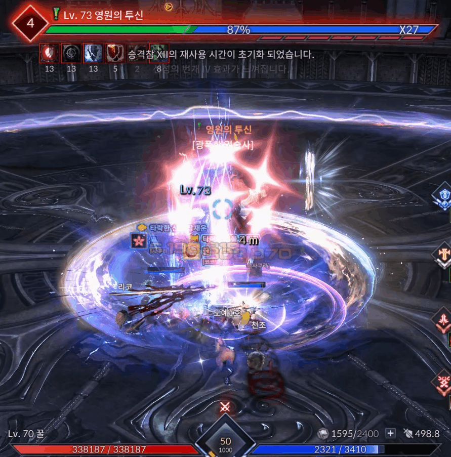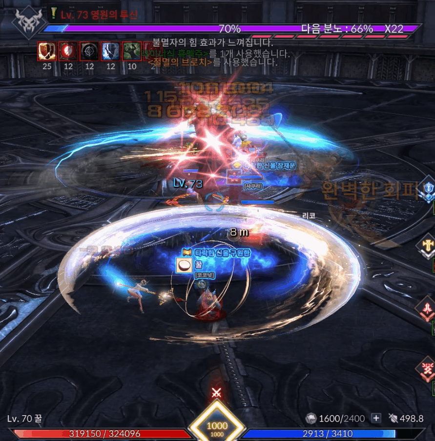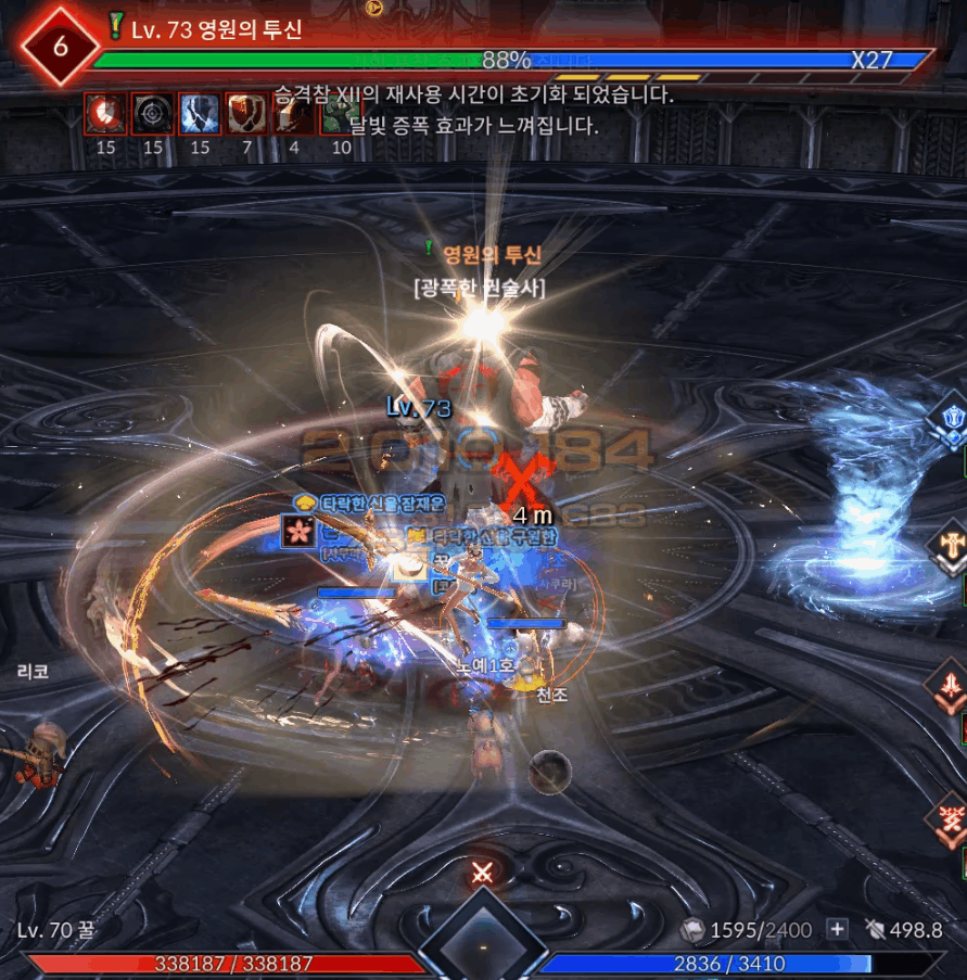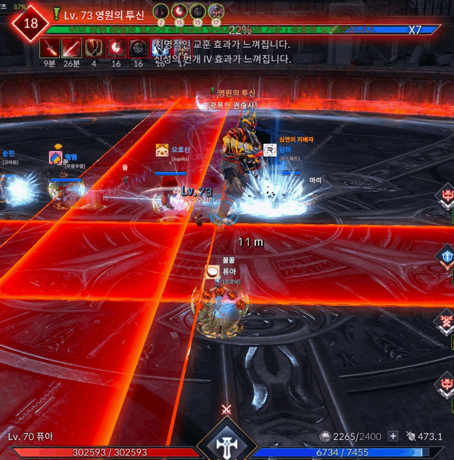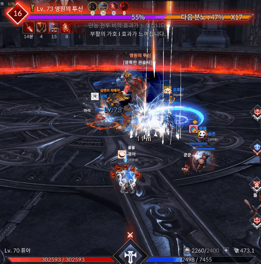 움짤로 보는 광기의 투기장[영원의 투신]안녕하세요. 월광무사 유저 꿀 입니다. 2020년 7월 23일 광기의 투기장[영원의 투신] 인스턴스 던전이 업데이트 되었습니다. 트라이를 하실 분들을 위해 간단한 공략을 준비했으니 도움이 되길 바라며 공략을 시작합니다. 해당 인던은 권술사 클래스의 스킬들을 모티브로 만들어진 인던입니다. 따라서 패턴들이 대부분 실제 권술사의 스킬로 이루어져 있기 때문에 패턴 설명을 권술사의 스킬명으로 서술하였습니다. 이번 공략은 보호막 패턴 발생을 최소화하기 위해 탱패턴까지 서술했습니다. 준비된 움짤의 각각 용량은 40~80MB지만 갯수가 많아 로딩이 좀 오래 걸릴 수 있습니다. 크롬 브라우저로 켜놓고 잠시 기다리시면 로딩이 끝나 부드러운 움짤 공략을 보실 수 있습니다. 양해바랍니다. ===================================================== 공략 전 알아두어야 할 사항 영원의 투신은 손과 발을 이용한 공격을 합니다. 손을 이용한 공격에 피격 시 마다 ![]() 탁기 침투 디버프가 걸리며 발을 이용한 공격에 피격 시 마다 ![]() 마력 침투 디버프가 걸립니다. 탁기 참투나 마력 침투 디버프가 3중첩이 되면 ![]() 발작 감지 디버프가 1중첩 쌓이게 됩니다. 발작 감지 디버프가 3중첩이 되면 ![]() 20초간 아무런 조작도 할 수 없게 되는 약화 디버프가 생기며 이어서 영원의 투신이 나약한 녀석이 보이는군. 패턴을 사용합니다. ![]() 보호막 파괴 성공 시 ![]() 영원의 투신에게 축적 버프가 쌓이며 5중첩이 되면 축적한 기운을 해방하여 더욱 강력해집니다. 보호막 파괴 실패 시 ![]() (붙잡히게 되면 짧지만 신나는 롤러코스터를 탈 수 있습니다. 여러분도 도전해보세요!) 전멸기를 시전하며 해당 패턴 후 부활하는 플레이어는 바로 즉사하게 되는 디버프가 맵 전체에 부여됩니다. 광기의 투기장[영원의 투신]은 최대한 피격당하지 않으며 보호막 패턴이 나오지 않게 유도하며 플레이 해야합니다. 오른손 - 강타 ![]() [ 회피 가능 / 방어 가능 ] 영원의 투신이 오른손으로 공격한 후 다시 후려칩니다. 강타 피격시 경직에 걸립니다. 영원의 투신의 체력이 69% 밑으로 내려가면 오른손-강타의 패턴이 강화됩니다. ========================================================== 오른손 - 강타 - 밀어치기 [체력 69%이하] ![]() [ 회피 가능 / 방어 가능 ] 밀어치기 피격시 다운됩니다. 오른손 - 왼손 - 날아차기 - 후퇴 - 일격타(랜타) ![]() [ 회피 가능 / 방어 가능 ] 후퇴 이후 일격타는 랜덤타겟에게 시전합니다. 일격타 피격 시 공중에 붕 떠서 날아가게 되니 주의하시기 바랍니다. 오른손 - 왼손 - 승천타 - 올려차기 ![]() [ 회피 가능 / 방어 가능 ] 위로 뛰어오르는 동작이 올라가고 내려갈때 총 2타이니 방막에 신경써야 합니다. 내리찍기 피격 시 다운되며 보호막, 강축으로 저항 불가능합니다. ========================================================== 오른손 - 왼손 - 승천타 - 올려차기 - 공중차기 [HP 69% 이하] ![]() [ 회피 가능 / 방어 가능 ] [ 공중차기 회피 가능 / 방어 불가 ] 영원의 투신의 체력이 69% 이하가 되면서부터 승천타 - 올려차기 이후 눈이 반짝이며 어글자를 향해 공중차기(스턴)을 사용합니다. 왼손 - 오른손 - 날아차기 - 일격타 ![]() [ 회피 가능 / 방어 가능 ] 어글자만 바라보고 쓰는 패턴입니다. 열심히 딜해주면 됩니다. 어딜 도망 가느냐! (거리랜타) ![]() [ 회피 가능 / 방어 가능 ] 패턴 구분 : 날아차기(발) - 어퍼컷(손)(다운) - 일격타(손) 영원의 투신으로부터 일정 거리 밖에 있을 시 나오는 패턴입니다. 아픈건 둘째치고 패턴 발동속도가 빠르기 때문에 디버프가 순식간에 쌓이니 범위 밖으로 벗어나 거리랜타가 뜨지 않도록 주의해야 합니다. ========================================================== 허튼 수작을 부리는군! (부활랜타) [HP 79% 이하] ![]() [ 회피 가능 / 방어 가능 ] 패턴 구분 : 발찍기(발)(스턴) - 전방난타(손) - 승천타(손) 영원의 투신과 전투 도중 부활 관련 스킬이나 아이템을 사용한 대상에게 사용하는 패턴입니다. 첫 찍기 피격 시 스턴에 걸리며 이후 승천타 찍기에 피격 시 다운됩니다. 나락으로 보내주마! (근-원-전체) [HP 85% 이하] ![]() [ 근폭 원폭 회피 불가 / 방어 불가 ] [ 광역폭발 회피 가능 / 방어 불가 ] ========================================================== 지옥으로 보내주마! (원-근-전체) [HP 85% 이하] ![]() [ 근폭 원폭 회피 불가 / 방어 불가 ] [ 광역폭발 회피 가능 / 방어 불가 ] 영원의 투신이 약 1분 주기로 사용하는 패턴입니다. 양손을 두번 부딪히는 준비 동작이 있습니다. 근폭이나 원폭 피격 시 스킬 사용불가 디버프에 걸리며 다운됩니다. 광역폭발 피격 시 공중에 높게 뜨며 바닥에 떨어지면 다운됩니다. 멘트는 영원의 투신의 분노 상태에 따라 다르며 비분노시 나락 / 분노시 지옥으로 고정됩니다. 따라서 비분노시 근-원-전체 분노시 원-근-전체 입니다. ![]() 8월 13일자 패치로 멘트에 따라 근원/원근이 고정되게 바뀌었습니다. 이제 분노, 비분노 상관없이 멘트에 맞게 대처하시면 됩니다. 일격타 - 뒷발차기 [HP 85% 이하] ![]() [ 회피 가능 / 방어 불가 ] 영원의 투신이 전방에 생일격타를 내지른 뒤 후방을 한번 훑은 후 뒷발차기를 합니다. 
