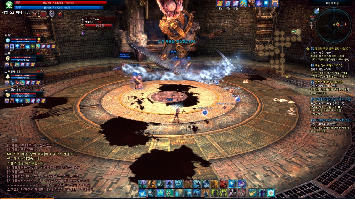 좌측의 파티원 정보창이 바뀌었습니다. 체력바와 마력바가 좀 더 눈에 띕니다. 버프&상태이상 지속시간 표시가 아이콘 밑에 표시되어 알아보기 편해졌습니다. (하지만 내가 걸어준 버프 지속시간은 여전히 제대로 표기되지 않지) 딜러들의 직업아이콘이 빨강색에서 금빛으로 바뀌었습니다.