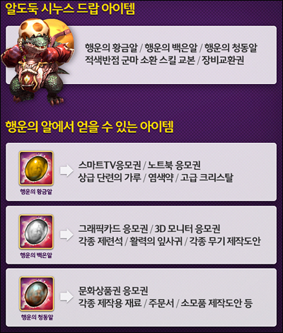 [이벤트]황금의 알을 찾아라[행운의 황금 알 찾기 이벤트 안내] ▣ 이벤트 일정 : 2011년 06월 07일 (화) ~ 2011년 06월 19일 (일) ▣ 이벤트 내용 • 아르보레아 곳곳에 등장하는 알도둑 시누스를 잡고 <행운의 알>을 모아 경품 응모가 가능합니다. • 경품 응모만이 아니라 적색군마 스킬교본, 강화 크리스탈, 장비 교환권 등! 다양한 아이템도 얻을 수 있는 기회를 꽉 잡으세요. ▣ 이벤트 경품 ▣ 당첨자 안내 : 2011년 06월 24일 (금) 경품 응모 방법 • 획득한 <행운의 알>을 마우스 오른쪽 클릭하면 경품권으로 변환됩니다. • <행운의 알>로 얻을 수 있는 5종의 경품 응모권을 일정 수량만큼 모으면 추첨을 통해 선물을 보내드립니다. ν 지정된 수량만큼 경품 응모권을 모으신 분들 중 추첨을 통해 경품을 보내 드립니다. ν 응모권은 각 계정의 서버별 소지 아이템(소지품 소지 개수 + 창고 소지 개수)을 모두 합산하여 계산되며, 응모권을 많이 모을 수록 당첨 확률이 높아집니다. • 장비 교환권 아이템은 도시의 교환 NPC를 통해서 52레벨 강화 가능한 전설급 무기로 교환 가능합니다. • 동일인이 1개 이벤트에서 복수로 당첨된 경우 별도의 고지가 없는 한 최선순위의 당첨 자격만 인정됩니다. • 아래의 사유에 해당하는 경우 당첨 대상에서 제외될 수 있으며, 당첨 발표 후 확인된 경우 당첨이 취소될 수 있습니다. ① 당사의 직원 및 그 가족, 총판업체 등 당사와 이해관계가 있는 경우 ② 테라 약관 및 운영정책을 위반하여 제재를 받은 계정의 경우 ③ 계정 정보를 포함하여 개인정보를 허위로 입력한 경우 ④ 당사에 과실에 의하지 않은 사유로 당첨자의 주소지로 발송이 불가한 상태가 1개월 이상 지속될 경우 ⑤ 수취인 부재, 당첨자가 기재한 배송 정보의 오류 등의 사유로 발송된 경품이 반송된 경우 ⑥ 당첨 사실에 대한 고지가 있었음에도 당첨자가 경품 수령의사를 명백히 하지 않은 경우 또는 거부 의사를 밝힌 경우 • 당첨자는 당첨 발표 후 영업일 기준 3일 이내에 당첨자의 한게임 개인정보 상의 이메일 주소를 통해 당첨 확인 및 관련된 안내(개인정보 확인 및 수정 요청 포함)를 받으실 수 있습니다. (휴면 계정 상태 및 이메일 정보 오류 등의 이메일 수신의 책임은 당첨자에게 있으며, 안내메일을 받지 못했을 경우, 고객센터를 통해 재발송을 요구하실 수 있습니다.) • 당첨자 발표 후 1개월이 지난 시점까지, 당첨자의 경품 수령 의사를 밝히지 않을 경우 당첨이 취소될 수 있습니다. • 제세공과금은 당첨자의 부담이며 당첨 안내 시 지정된 기한까지 입금되지 않을 경우 당첨이 취소될 수 있습니다. (문화 상품권은 제세공과금 부담에서 제외됩니다.) • 당첨자 발표를 위해 계정명을 비롯한 서버, 캐릭터명 등 일부 계정 정보가 테라 공식 홈페이지에 공지될 수 있습니다. • 경품 배송을 위해 당첨자의 이름, 전화번호, 주소 정보가 배송 대행 업체로 전달됩니다. 이를 원하지 않으시는 경우, 당첨자는 당첨을 거부할 수 있습니다. 테라의 첫 대규모 업데이트에 대한 여러분의 성원에 감사 말씀 드리며, 알도둑 시누스와 함께하는 이벤트로 행운의 주인공이 되시길 기도합니다. 감사합니다. |