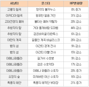 사냥터 명 | 몬스터 명 | HP 보정치 |