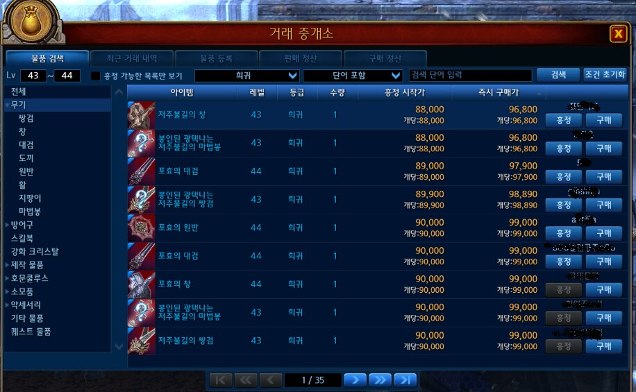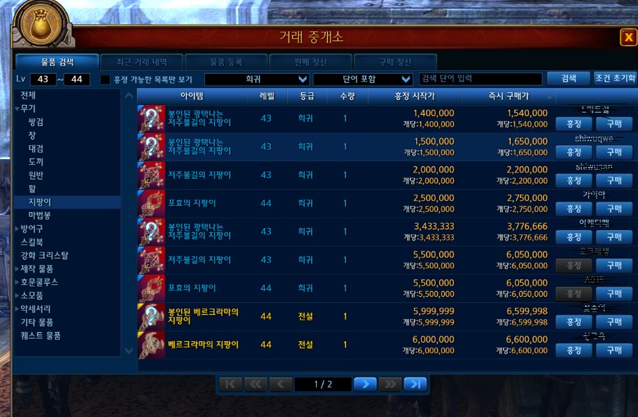 현제 거래소에 올라온 43~44까지의 지팡이 매물입니다