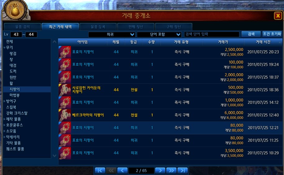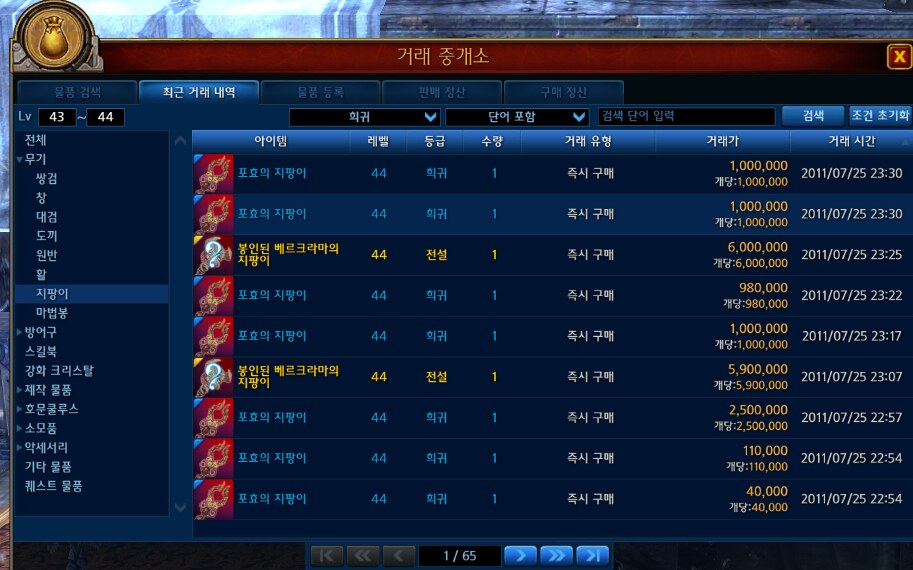 사람들이 파템을 팔때 모두 재물템이겠지하며 무기순으로 싼순을 정열하여... 보통팝니다.. 제발; 지팡이는 그러지 맘시다 이제 47전설~48파템 거래소 매물을 보도록 하겠습니다