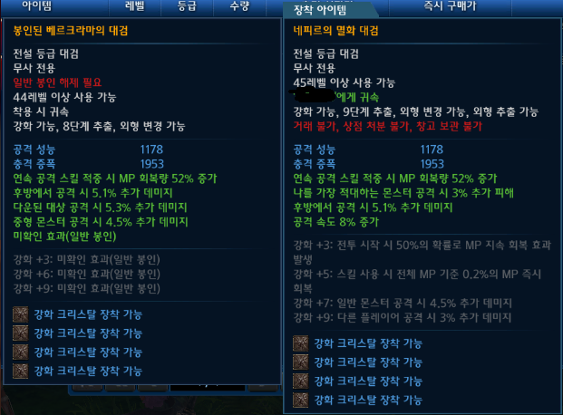 45렙 찍고 네피르 대검과 경갑을 받아보았습니다. 베르크라마 셋과 성능은 동일,