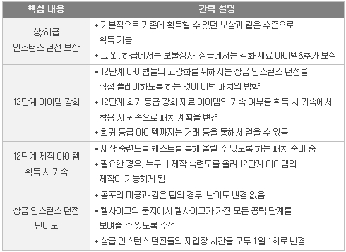 1. 현재 가치가 높은 아이템(현재의 킬리언/사령술사/불새 시리즈, 수제 시리즈, 자유 사냥 네임드 아이템 등)을 명품으로 만들거나 높은 단계까지 강화한 사람들은 상대적인 박탈감이 있습니다. 이에 대해서는 미리 안내 드리지 못한 점에 대해 죄송한 마음이 큽니다. 하지만 패치 후에도 기존의 장비를 그대로 활용하실 수 있으니 여러분의 너그러운 이해를 부탁 드립니다. 2. 새롭게 공개된 추가 아이템들 대부분이 획득 시 귀속 아이템인데, 패치 후에는 더 이상 인스턴스 던전을 플레이하는 것으로 추가적인 보상을 얻을 수 없게 되는 것인가요? 이 부분은 지난 공지가 새롭게 추가되거나 기존의 능력이 바뀌는 아이템들에 대해서만 안내를 드려, 오해가 발생한 부분인 것 같습니다. 추가 되는 아이템들은 대부분 획득 시 귀속이지만 기존에 획득이 가능했던 아이템들은 이전 상태 그대로 드랍되기 때문에 지금까지 획득하던 보상과 동일한 수준의 보상을 기본으로 획득하실 수 있을 것입니다. 기본의 보상 외에도 하급 인스턴스 던전에서는 보물상자 세트가 추가되었습니다. 비록 그 획득 확률은 낮지만 획득하게 될 경우, 높은 가치를 가지는 착용 시 귀속 아이템이기 때문에 하급 인스턴스 던전 진행 시 노려볼 만한 목표라고 할 수 있습니다. 상급 인스턴스 던전에는 12단계 강화 재료 아이템들이 추가되었습니다. 12단계 강화 재료 아이템들은 모두 획득 시 귀속이라고 지난 공지로 안내 드린 바 있으나, 희귀 등급의 강화 재료 아이템의 경우는 착용 시 귀속으로 그 속성을 변경할 것입니다. 또한 상급 인스턴스 던전에는 강화 재료 아이템들 외에도 추가적인 보상이 적용되어 이전 대비, 더 많은 보상을 얻을 수 있습니다. 3. 상급 인스턴스 던전들에서 드랍되는 아이템들은 12단계이고, 12단계 아이템들은 획득하기가 힘들어 강화가 어려워질 것 같습니다. 이번 아이템의 추가는 인스턴스 던전의 활용도를 높이고자 하는 것을 최우선 목표로 하고 있습니다. 특히 상급 인스턴스 던전들의 경우, 아이템을 얻는 것만이 목적이 아니라 해당 아이템들을 어느 정도 이상 강화하기 위하여 직접 인스턴스 던전을 플레이하는 것을 기본으로 하고 있습니다. 일반 등급과 고급 등급의 12단계 아이템들의 경우, 필드에서 중형 몬스터를 사냥하면서 획득이 가능하도록 할 것이며, 희귀 등급의 12단계 아이템들은 상급 인스턴스 던전에서 착용 시 귀속 형태로 드랍될 것입니다. 전설 등급 12단계 아이템들의 경우, 상급 인스턴스 던전들에서 획득 시 귀속 형태로만 드랍되는 것을 생각하고 있기 때문에, 직접 인스턴스 던전을 플레이해야만 강화를 위한 강화 재료 아이템을 얻을 수 있습니다. (제작을 통한 12단계 제작 강화 재료 아이템의 추가도 준비 중입니다.) 기존의 방식과는 다르기 때문에 지속적인 모니터링을 통하여 수정이 필요한 부분을 계속해서 다듬어갈 예정입니다. 4. 12단계 제작 아이템의 경우 획득 시 귀속이라고 들었습니다. 이렇게 되면 제작을 할 수 없는 사람들은 제작 아이템을 얻을 수 없고, 제작자는 만든 것을 팔 수 없게 되어 문제가 많을 것 같습니다. 12단계 제작 아이템들이 획득 시 귀속이 되면서, 제작 숙련도를 높이고자 하는 분들이라면 누구라도 퀘스트를 통해 기존 대비 적은 비용과 노력을 들여 제작 숙련도를 높일 수 있게 됩니다. 따라서, 12단계 아이템을 높은 단계까지 강화하고자 하는 분들은 직접 12단계 아이템을 제작하여 사용하거나, 강화 재료 아이템으로 활용할 수 있습니다. 또한 12단계 아이템은 창고 보관이 가능하므로, 하나의 캐릭터만 제작 숙련도를 올려 놓아도 됩니다. 08월 25일 패치에는 제작을 통해 제작 가능한 12단계 전설 등급 강화 재료 아이템 추가가 있을 예정이며, 퀘스트를 통한 제작 숙련도 습득에 대한 패치 내용은 일정이 정해지는 대로 다시 안내 드리겠습니다. 5. 현재 상급 인스턴스 던전들의 난이도도 높습니다. 아이템이 강해진다고 해도 지금 이상으로 상급 인스턴스 던전들의 난이도가 높아진다면 아이템의 강함 여부와 상관 없이 공략이 너무 어려울 것 같습니다. 상급 인스턴스 던전들의 밸런스와 관련하여서는, 새롭게 추가되는 아이템을 가지고 테스트를 진행하였으며, 공포의 미궁과 검은 탑에 대해서는 밸런스 변경을 하지 않기로 결정하였습니다. 단, 상급 켈사이크의 둥지의 경우, 현재 4개의 공략 단계를 가진 켈사이크가 3개의 공략 단계 밖에 보여주지 않는 경우가 있어, 이를 4개 공략 단계를 모두 활용할 수 있도록 하는 수정이 진행됩니다. 인스턴스 던전에 추가적으로 변경되는 부분은 재입장 시간으로, 08월 18일 패치 이후 상급 인스턴스 던전들의 재입장 시간이 모두 1일 1회로 변경됩니다. 재입장 시간에 대해서도 지속적인 모니터링을 통해 수정이 필요할 시, 계속해서 조정해 나갈 예정입니다. 지금까지 08월 18일에 진행될 패치 내용에 대한 추가 설명을 안내 드렸습니다. 추가 설명을 통해 여러분께서 궁금해하시고 또 우려하셨던 부분들이 조금이나마 해소되시길 바라며, 조만간 상세 패치 내용으로 다시 찾아 뵙겠습니다. 감사합니다. |