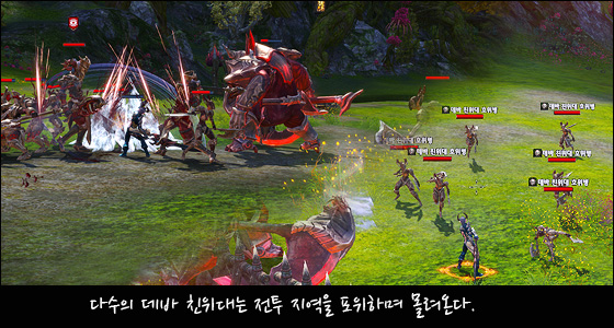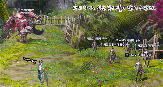 울타리 너머의 부하 몬스터는, 데바 꼭두각시 조종사를 처치하면 사라지니 데바 꼭두각시 조종사에게 전투를 집중하시는 것이 좋습니다. 데바 친위대 아부카이젤의 HP가 점점 소모됩니다! 첫 번째 관문이 끝나가나 싶은 이때, 또 한번의 소환 몬스터인 데바 친위대가 우르르 몰려옵니다. 이런 때일수록 더욱 집중하시고 포위 당하기 전에 몬스터를 처치하세요.