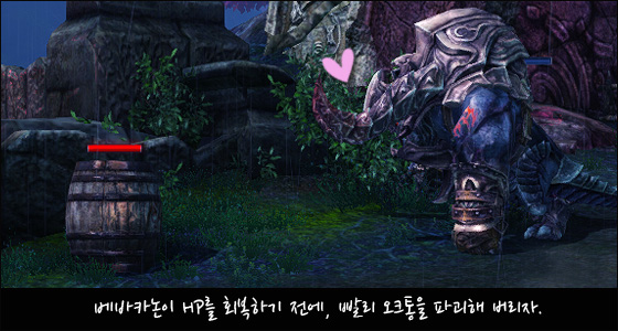 베바카논은 주기적으로 오크통을 소환하여 전투에 활용하는데요, 오크통이 소환될 때마다 게임 화면에 메시지가 출력되어 쉽게 알 수 있습니다. 체력 회복 오크통 체력을 회복해주는 오크통이 소환되면, 베바카논이 오크통을 마구 부수는데, 오크통이 부서질 때마다 베바카논의 HP가 조금씩 회복됩니다.