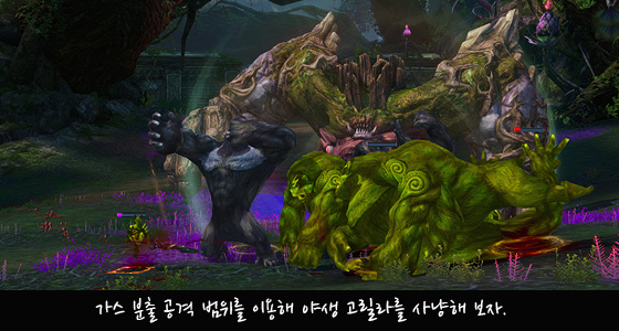 이 가스 분출 공격은 장단점을 갖고 있는 공격으로, 공격 범위 안에서 야생 고릴라들의 이동속도가 감소하기 때문에 이를 활용하여 소환 몬스터를 쉽게 정리할 수 있습니다. 하지만 공격 범위 안에 있다 몬스터의 육중한 두 팔이 가하는 내려치기 공격에 피격당하면 철벽의 파괴 불꽃 디버프가 발동되니 주의!