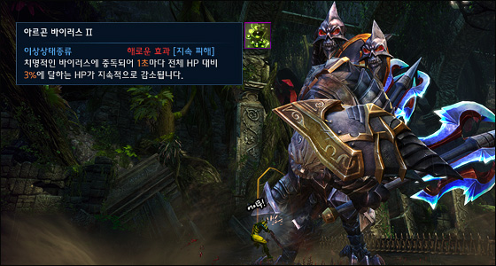 아르곤 바이러스 라마얀 자바르만이 철퇴를 휘두르는 중거리 공격에 피격되면 HP를 소모시키는 디버프, 아르곤 바이러스에 걸리게 됩니다.