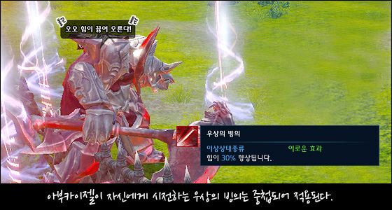 아부카이젤은 HP가 소모될 때마다 몬스터를 소환하고, 지속적으로 자신에게 우상의 빙의 버프를 시전해 힘을 강화하는 전투 방식을 갖고 있습니다.