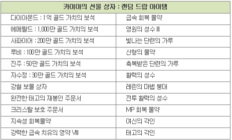 ▣ 참고사항 • 다이아몬드, 에메랄드, 사파이어, 루비, 진주, 자수정 아이템을 상점에 판매하면 각 아이템에 해당하는 골드를 습득할 수 있습니다. • 카이아의 선물 상자는 창고 공유 불가, 상점 판매 불가, 거래 불가 아이템입니다. • 사용 중 부주의로 인하여 삭제 또는 파괴된 아이템은 복구되지 않습니다. 채 식지 않은 철벽의 수련장에서의 열기가 새로운 인스턴스 던전에서도 계속 될 것을 기대하며, 이벤트의 행운이 여러분 모두와 함께하길 바랍니다. 감사합니다.