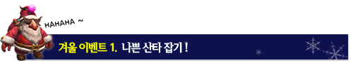 ▣ 이벤트 기간 • 2011년 12월 08일 (목) 10:00 ~ 2011년 12월 29일 (목) 정기점검 전까지 ▣ 이벤트 내용 • 이벤트 기간 중, 아르보레아 곳곳에 등장하는 '심술쟁이 산타'와 '욕심쟁이 산타'를 사냥하면, 산타들도 탐내는 신기하고 다양한 아이템이 쏟아집니다.