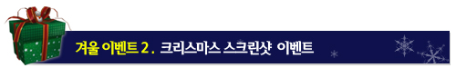 ▣ 이벤트 기간 • 2011년 12월 08일 (목) 10:00 ~ 2011년 12월 29일 (목) 정기점검 전까지 ▣ 이벤트 내용 • 아름다운 테라의 크리스마스 풍경을 배경으로 한 스크린샷을 찍거나 팬아트를 그려 각 게시판에 [겨울] 말머리를 붙여 응모하신 분들 중 추첨을 통해 30분께 상품을 드립니다. ▣ 이벤트 상품 • 삼성 싱크마스터 24" 모니터 (총 30명) ▣ 당첨자 발표 • 2012년 01월 05일 (목)