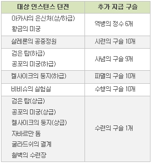 ▣ 서버간 인던 파티 매칭 • 원정대 포상 아이템 추가 ν 서버간 인던 파티 매칭 기능을 통해 인스턴스 던전에 진입하여 최종 보스 몬스터까지 클리어했을 경우, 추가 보상인 ‘원정대의 포상’ 아이템이 우편으로 지급됩니다. ν 원정대 포상 아이템은 공략한 인스턴스 던전에 따라 ‘원정대의 포상 I ~ IV’까지 존재합니다. 원정대 포상 아이템의 등급이 높을 수록, 가치있는 보상이 등장할 가능성이 높아집니다. ν 원정대 포상 아이템의 구성은 아래와 같습니다. • 구슬 아이템 추가 지급 ν 서버간 인던 파티 매칭 기능을 통해 인스턴스 던전 클리어 시, 기존에 등장하던 구슬 아이템이 추가 지급됩니다. ν 대상 인스턴스 던전 및 지급 내역은 아래와 같습니다.
