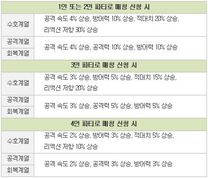 • 버프 강화 ν 서버간 인던 파티 매칭으로 인스턴스 던전에 입장 시, 부여되는 버프가 기존에 비해 더욱 강력하게 변경되었습니다. 특히 1인 상태 또는 적은 인원의 파티 상태로 매칭을 신청할수록 더욱 강력한 버프를 받을 수 있도록 개선하였습니다.