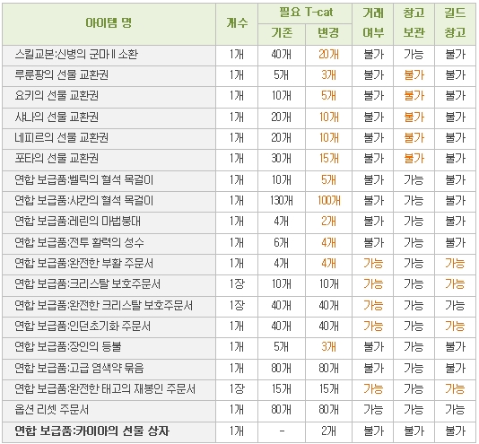 04월 12일 (목) 정기점검 이후 T-cat 상점 교환 아이템 추가, 거래 여부 및 T-cat 수량이 변경될 예정입니다. 정기점검 이후 T-cat 상점 교환 아이템 추가 및 변경될 내용은 아래와 같습니다. [T-cat 상점 아이템 변경 예정 안내] • 카이아의 선물 상자 ν 상점에 판매할 수 있는 보석류(다이아몬드, 에머랄드, 자수정 등), 소모성 물약, 빛나는/축복 받은 단련의 가루, 재료 아이템, 완전한 태고의 재봉인 주문서 등의 아이템 중 1개를 랜덤으로 습득할 수 있습니다. ν 게임 상에서 가치가 높은 아이템일수록 얻을 확률이 낮으니 이 점 유의하시길 바랍니다. • 일부 아이템의 필요 T-cat 개수와 거래 및 창고 보관 가능 여부가 변경되었습니다. • 자세한 변경 사항은 아래 표의 붉게 표시된 내용을 확인해 주시길 바랍니다.