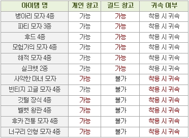 • 장신구 아이템의 속성 변경 ν 일부 아이템의 개인창고, 길드창고, 귀속여부가 변경하였습니다. ν 변경된 내역은 다음과 같습니다. • 로딩되지 않은 캐릭터의 표시 방법 개선 ν 아직 로딩 되지 않은 캐릭터도 마을 NPC의 경우처럼 회색의 이미지로 표시됩니다. ν 해당 업데이트 내역은 검은 틈 진행 시에 자세하게 확인하실 수 있습니다. ▣ 버그 수정 • 검은 틈 업적인 ‘너희들의 퀘스트 제공 패턴은 강중강약약!’을 달성하기 위하여 일일 퀘스트를 진행했던 내역이 초기화 되는 문제를 수정하였습니다.
