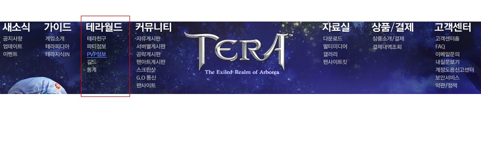 위에 보시는바와 같이 테라 공식 홈페이지 메뉴 입니다.