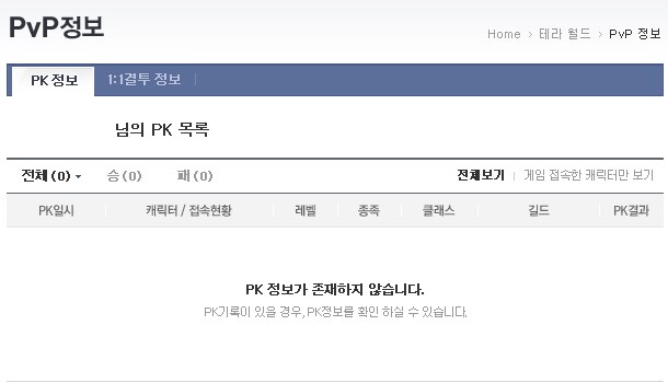 저기 테라월드 빨간 박스 안에 PVP 정보를 누르시면 ... 아래와 같이 (?) ... 뜨겠습니다.