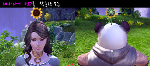 활짝 핀 해바라기를 그대로 머리 위에 매달 수 있는 밴드입니다.