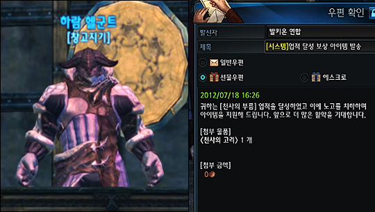 • 획득된 보상아이템은 우편으로 즉시 발송됩니다. 마을에 배치된 창고지기를 통해 발송된 업적 보상 아이템을 획득해 보세요.