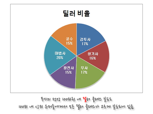 검투사는 강력한 스토킹 능력과 딜링 능력, 생존 능력을 보여줍니다. 업데이트 이후 가장 핫한 클래스이고, 실제로도 100위권 안 딜러 클래스 중 두 번째로 높은 비중을 차지할 정도로 강력한 면모를 보여주고 있습니다.