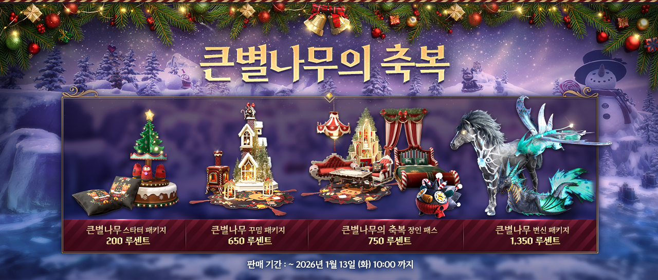 ※ 장인패스는 캐릭터당 1회 활성화되는 컨텐츠로, 계정 내 다른 캐릭터와 공유되지 않습니다. ※ 루센트로 판매되는 패스는 특수 상점에서 구매 버튼을 누르는 즉시 사용되어, 프리미엄 혜택이 활성화됩니다. <큰별나무 꾸밈 패키지> ■ 판매 기간: 2025년 12월 23일(화) 10:00 KST 부터 ~ 2026년 1월 13일(화) 10:00 KST까지 ■ 상품 안내