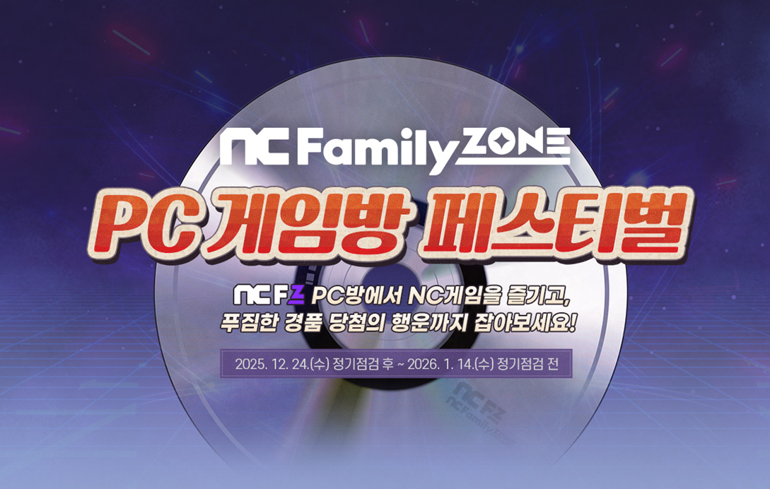 'NC Family ZONE PC게임방 페스티벌' 이벤트 안내안녕하세요. THRONE AND LIBERTY입니다. 12월 24일(수)부터 3주간 ‘NC Family ZONE PC게임방 페스티벌’ 이벤트가 진행됩니다. 이벤트는 NC 온라인 게임 7종, 모바일게임 2종과 퍼플 패키지 게임 2종, 라프텔 이용자 모두 함께 즐길 수 있는 이벤트이며, NC Family ZONE PC방에서 참여가 가능합니다. 이벤트 참여 방법과 경품 관련 상세 내용을 아래와 같이 안내드리오니 많은 관심과 참여 부탁드립니다. [NC Family ZONE PC게임방 페스티벌 이벤트 안내] ■ 이벤트 기간 : 2025.12.24.(수) 정기점검 후 ~ 2026.01.14.(수) 정기점검 전 ■ 당첨자 발표일 : 2026.1.15.(목) 16:00 ■ 당첨자 정보 입력 기간 : 2026.1.15.(목) 16:01 ~ 2026.1.21.(수) 16:00 [이벤트 참여 방법] ■ 이벤트 대상 NC 게임을 확인 후 NC Family ZONE PC방에서 게임 접속 후 플레이 ■ 이벤트 페이지 로그인 후 나의 PC방 누적 접속 시간 확인 ■ NC Family ZONE PC방 누적 접속 시간 달성 시 경품 자동 응모 ※ 누적 접속 시간 달성 시 별도 절차 없이 자동 응모 처리됩니다. [이벤트 및 응모 경품 목록] 1. 전설의 명작 PC게임 - 대상 IP: NC 온라인 게임 7종, 모바일게임 2종과 퍼플 패키지 게임 2종 (*리니지, 리니지2, 아이온, 블레이드&소울, 블레이드&소울 NEO, 러브비트, TL, 리니지M, 리니지2M, AION2, 어스토니시아 스토리, 환세취호전 플러스)