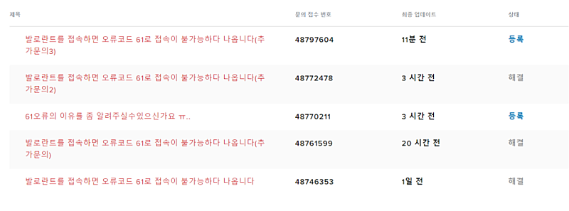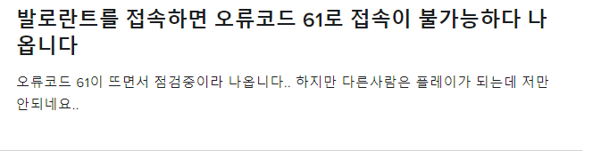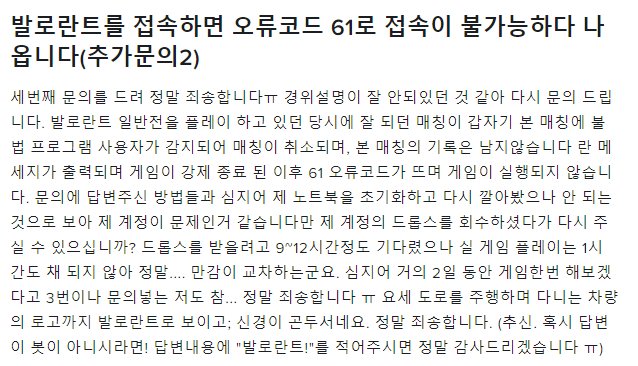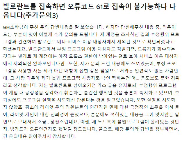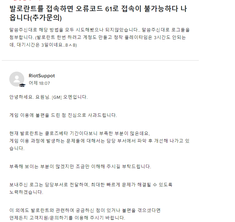 이게 무슨 오류죠 (오류코드 61편)음..매치 플레이를 하던 중, 갑자기 "해당 매칭에서 팀원 중 부정 프로그램 사용자가 감지되었습니다 해당 매칭을 무효화 합니다" 란 팝업창이 뜨면서 발로란트가 강종 되었습니다. 이후, 발로란트에 재접속을 하니, 61오류가 뜨면서 들어가지질 않더군요. 이에 발로란트 문의하기에 문의를 넣었습니다. [본 글은 약간의 스압이 있습니다]