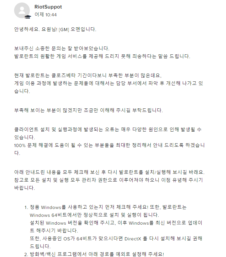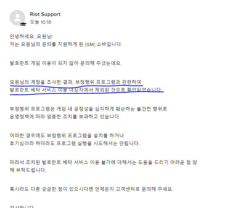 사실 이때까진 그저 평범한 접속 오류인줄 알았습니다. 해당 문의에 대한 고객센터 직원분의 답변입니다. 총 7개의 해결 방안을 제시해주셨는데요. 저는 그 7개를 다 시도해 보고도, 더이상의 발전이 없었고, 심지어 제 노트북 문제인가싶어 노트북을 초기화하고, 재설치하고도 진전이 없었습니다. 그러자 해당 답변의 마지막에 쓰인 로그들을 문의하기로 보내기로 결정했습니다 다행히도, 고객센터엔 본 로그들을 보는 방법들을 잘 정리해놓아서 로그들을 따는 것 까진 전혀 어려움이 없었는데요. 본 로그들을 보낸 문의입니다. 해당 문의 입니다. 밑에 관리자님의 답변은 짤린게 아니라, 저게 다입니다. 어.. 봇의 냄새가 스멀스멀 올라오죠. 하지만 전 기다렸습니다. 어.. 발로란트가 꼭 하고싶었거든요. 애초에 답변이 봇이라도 제가 올린 문의 내용과 잘 맞는 답변이지 않습니까. 성의도 보이고. 그래서 기다렸습니다. 그래서 다음날, 기대에 부풀어 다시 발로란트를 접속했습니다. 역시나. 61오류. 그래서 전 문의 하나를 더 보냈습니다. 본 문의의 마지막 내용은 어.. 봇이 아니였으면 좋겠다는 일말의 희망이였지요. 저는 노트북을 초기화 했다가 다시 설치하여도 안되는 61오류에, 이것은 계정의 문제임을 직감해, 드롭스권한을 회수하셨다가 다시 주셨으면 좋겠다는 문의를 드립니다. 하지만 그에 오는 답변은.. 띠용... 해괴한 답변이 왔습니다. 제 계정이 부정프로그램으로 적발? 세상. 이번 문의에도 저번문의에도 적혀있듯이 부정 프로그램이 적발된건 같은 매칭에 잡힌 제 팀원으로, 저와는 일면식도 없는 사람이였습니다. 그니까 흔히 말하는 '그저 지나가는 사람'이죠. 음... 아무래도 봇인거 확실한거 같은데, 답변내용이 문의내용과 맞지않고, 그저 적당한거 하나 끼워맞춘듯한 블리자드식 답변같은데, 아. 여기 라이엇이였죠. 음.......... 너무 어이가 없어진 나머지, 다시 문의를 보냈고, 지금 등록중에 있습니다. 발로란트가 아무리 클로즈 베타 기간이라 하루에 문의가 수백 수천 수만 개가 오더라고, 문의 답변에 봇을 쓰더라도, 애초에 문의 내용을 조금이라도 흝어봐야 된다고 생각합니다만.. 음... 뭐.... 아니라면 아니겠지요. 이상으로 긴글 읽어주셔서 감사하고. 칼라이 였습니다.