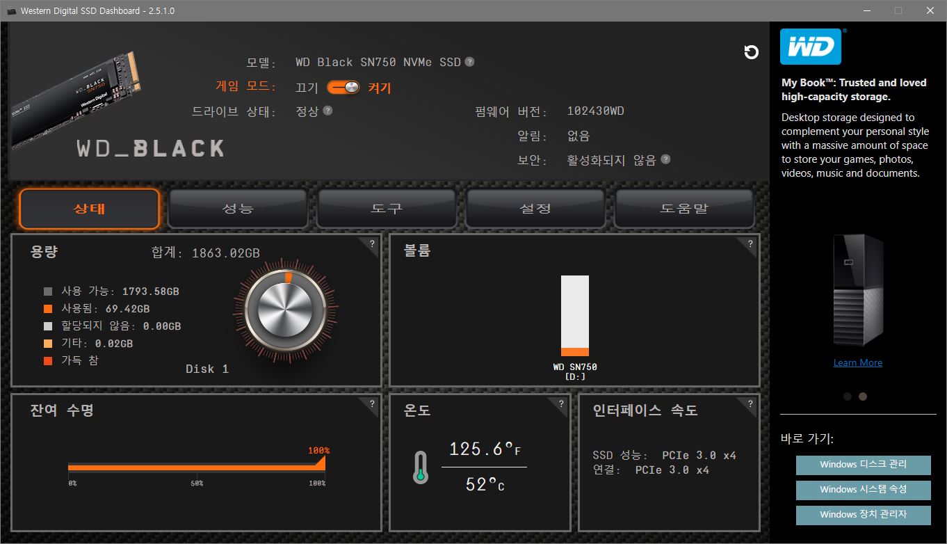 ※ 추가 정보 : WD Black SN750의 경우 Western Digital SSD Dashboard 프로그램에서 '게임 모드'를 켜거나 끌 수 있다. 이는 SSD의 저전력 모드를 비활성화하여 항상 최상의 속도