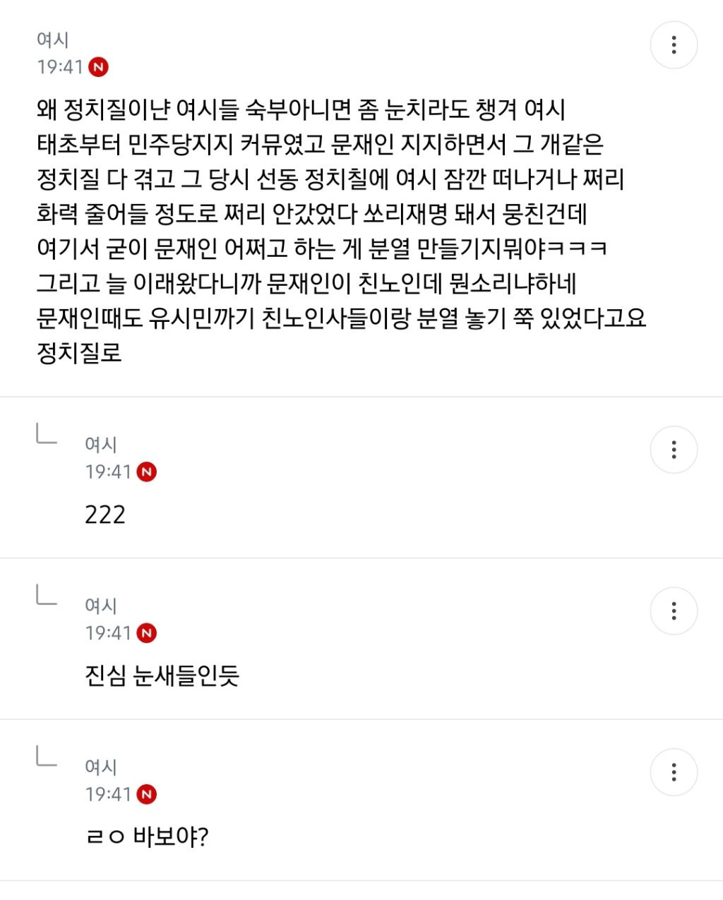 댓글이 뜻대로 안 되고 속내 다 까발려지니까 이제 막무가내로 그냥 문재인 까기 시작 (그래놓고 여시에서 깠다고 올리겠지 ㅋㅋㅋ) 근데 그것도 안 먹히니까 앞 댓에서 그냥 기싸움을 했는데 그 댓이 가관임ㅋㅋㅋㅋㅋ