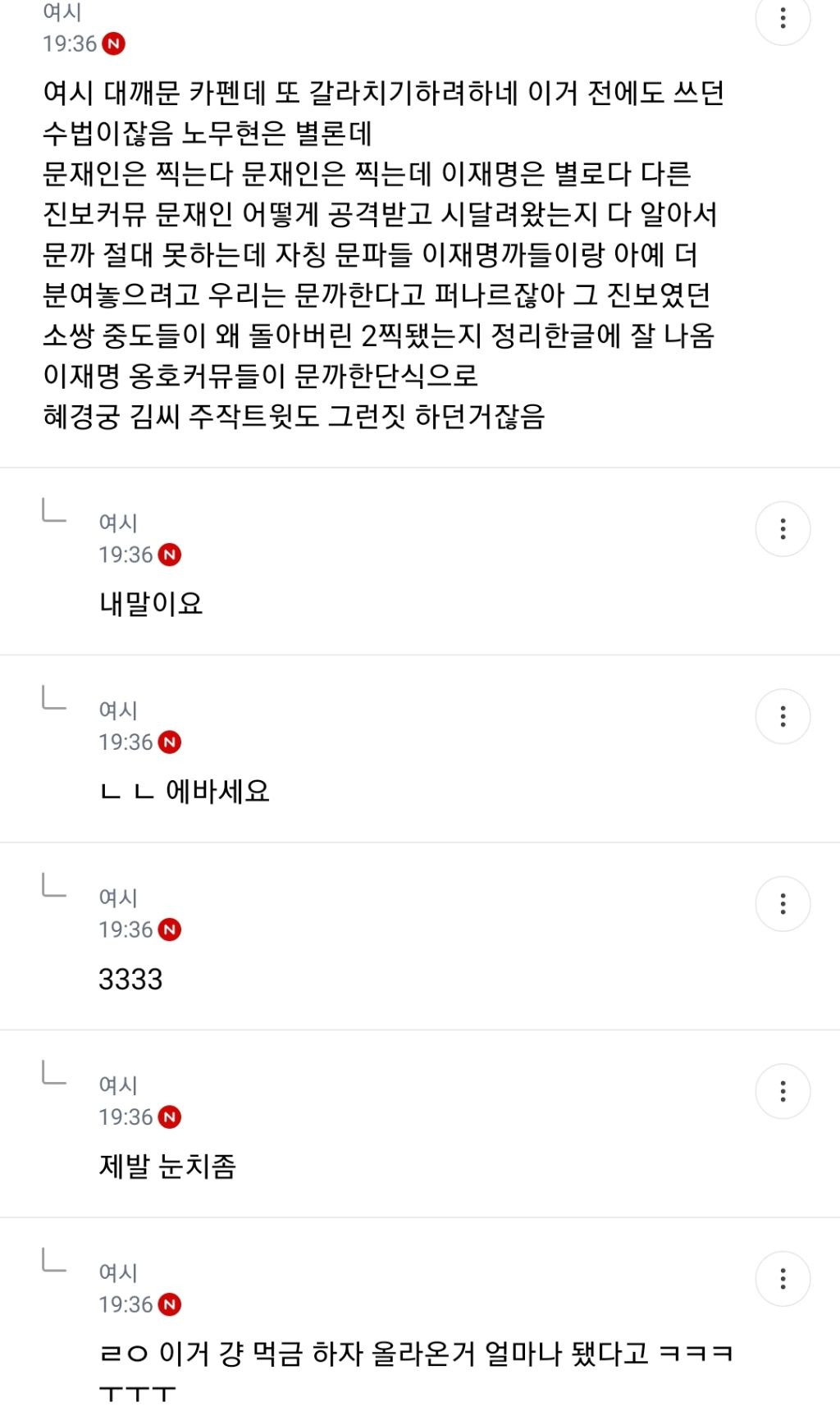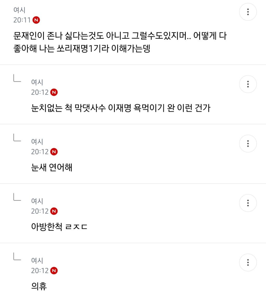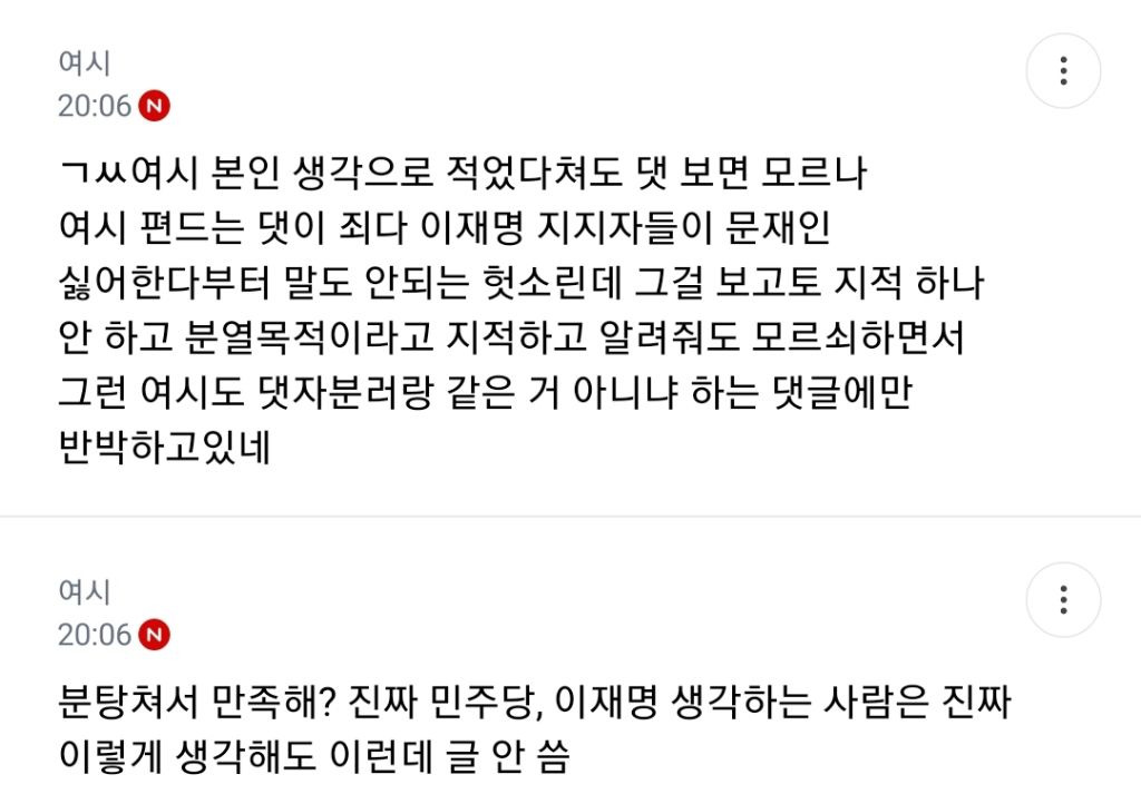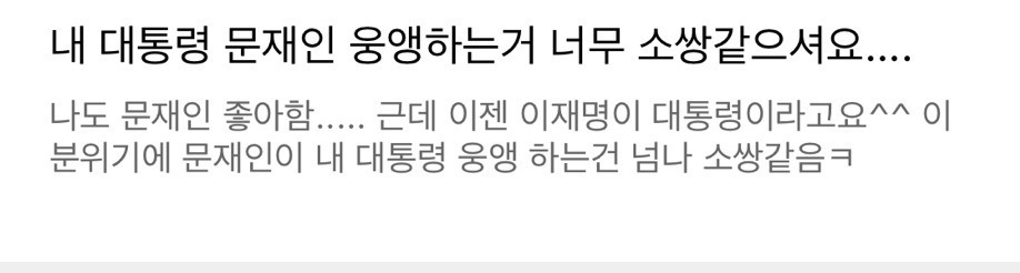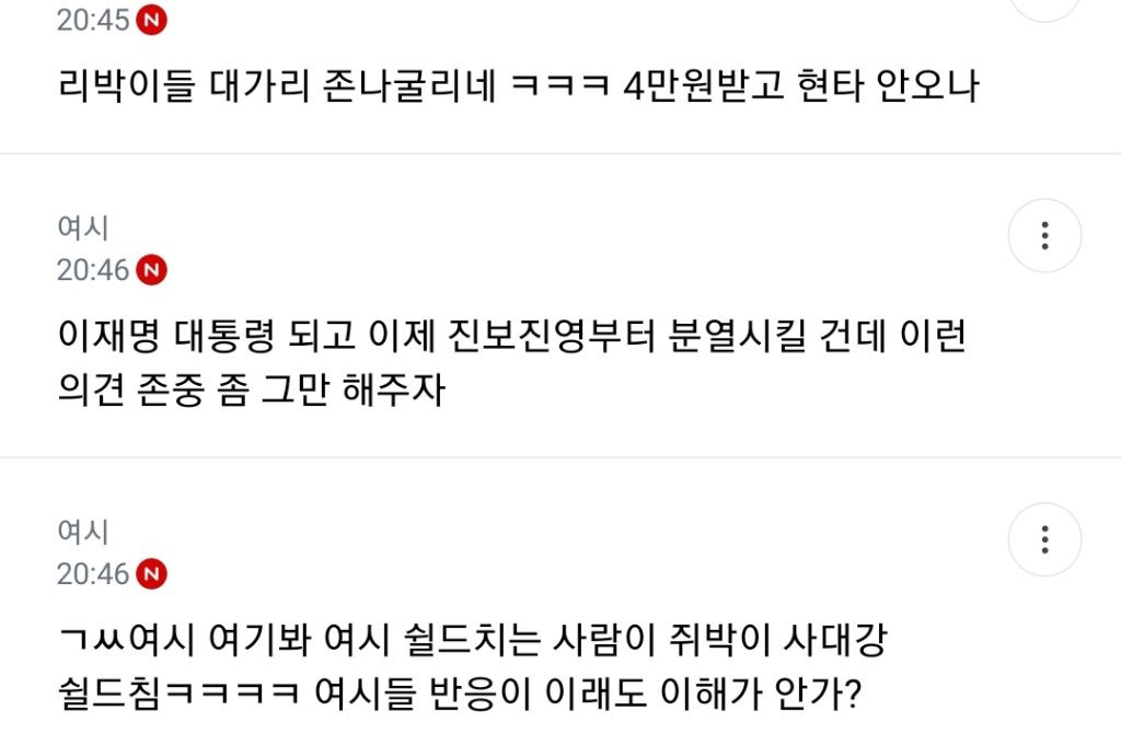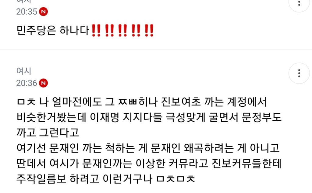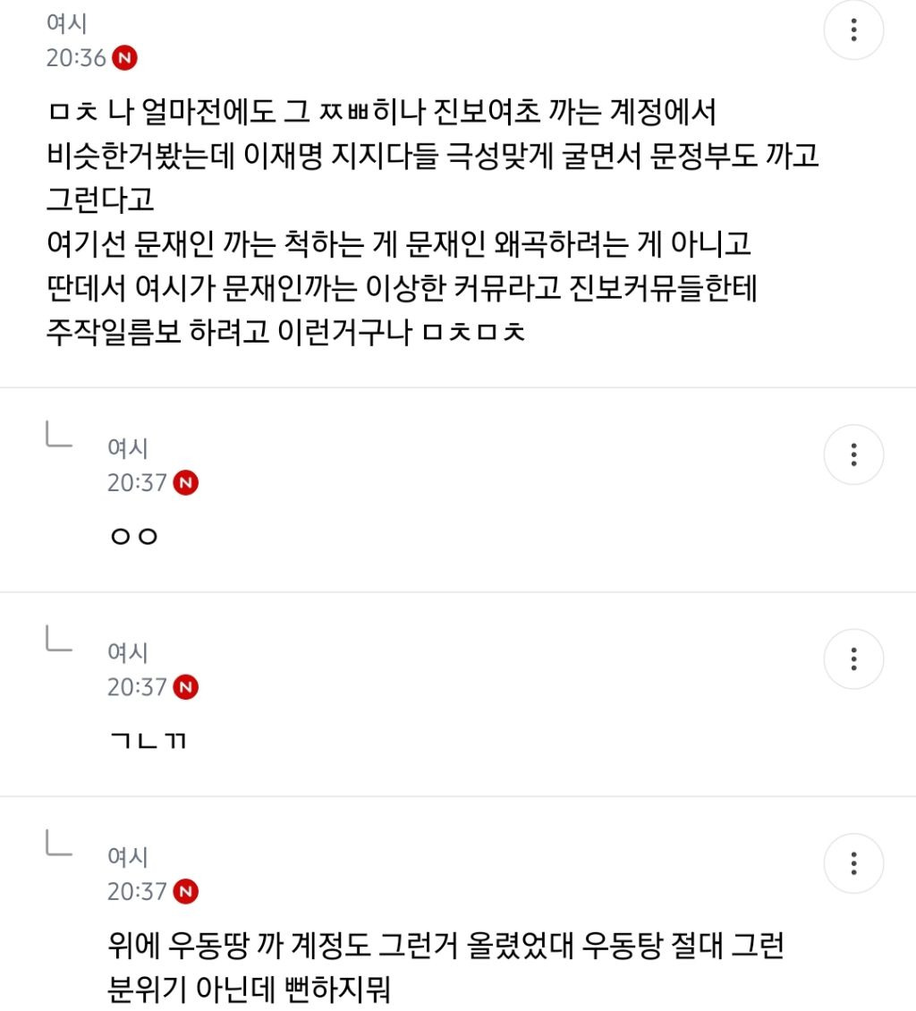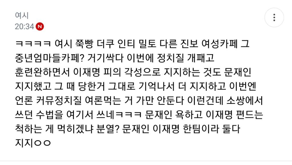 처음엔 글쓴 여시가 자기 생각 말한 것 뿐인데 입막한다 몰아간다는 식으로 쉴드치던 사람들(자분) 있잖아? 이 사람들이 원하던 진자 플 (문재인 까플이나 이재명 문재인 지지자 싸우는 플) 안 나오니까 자기들 스스로 ㅋㅋㅋㅋㅋㅋㅋㅋㅋㅋㅋㅋㅋㅋㅋ 나도 문재인 별로였지만... 이딴 댓글 달기 시작함