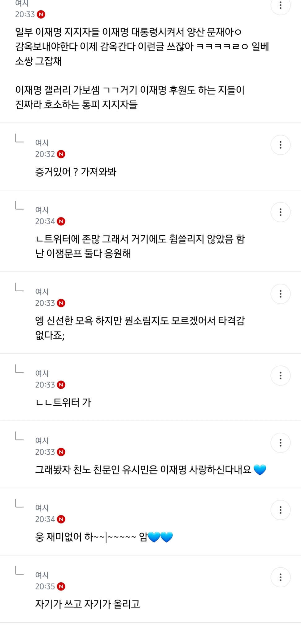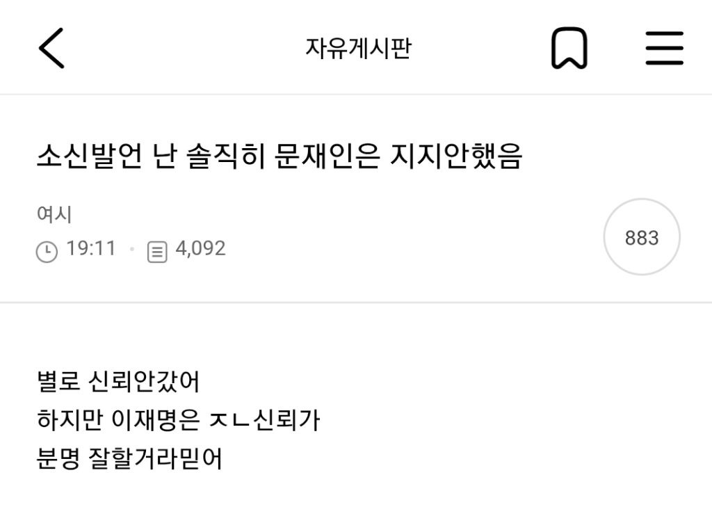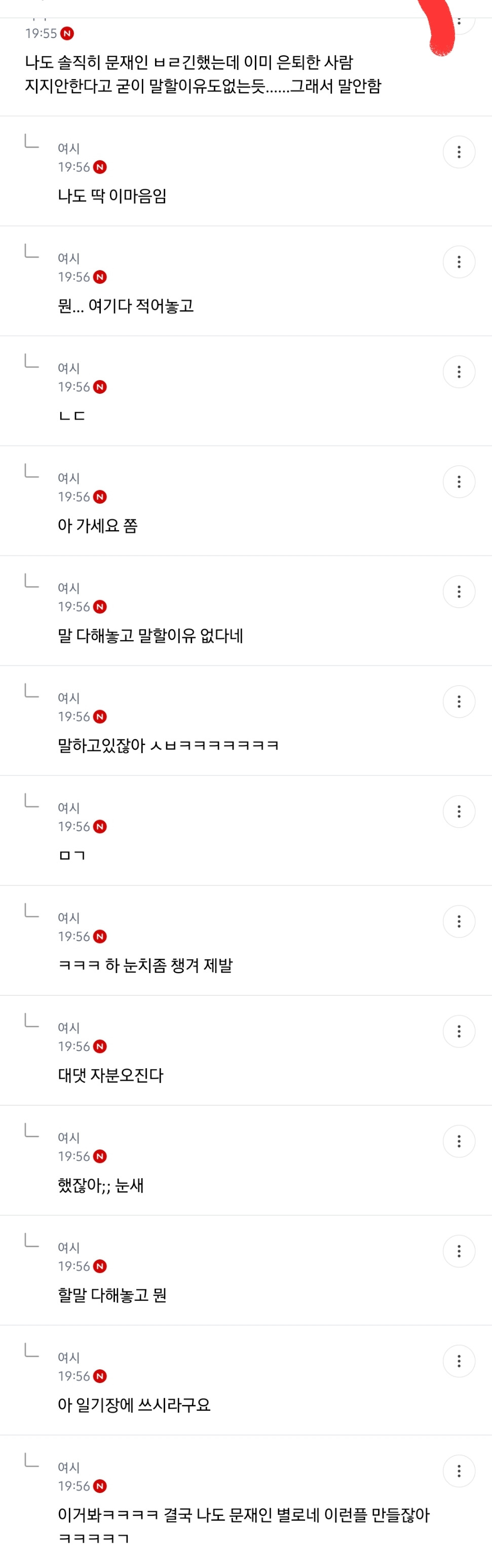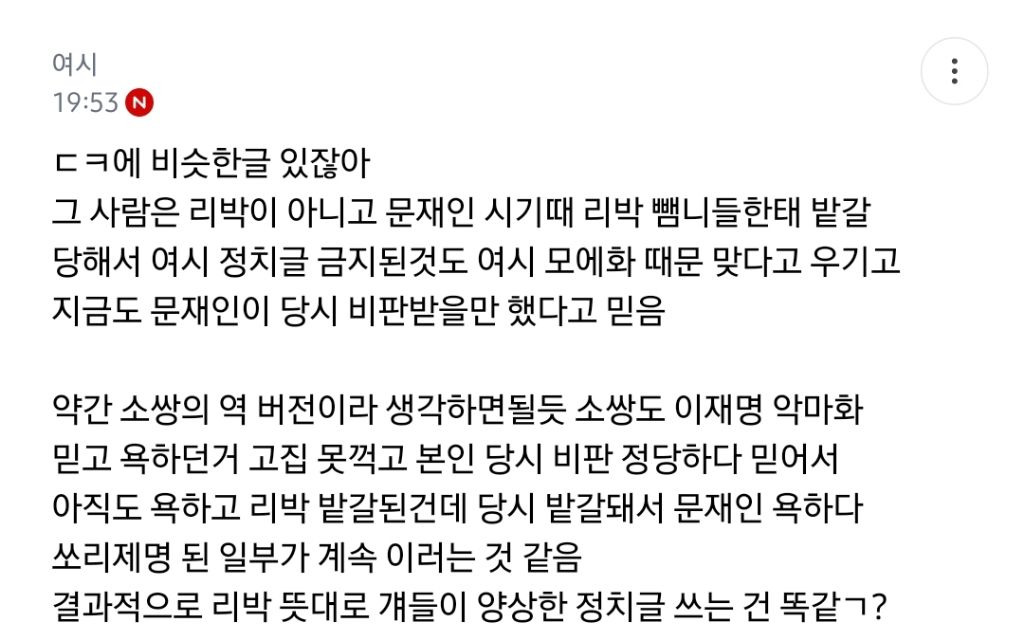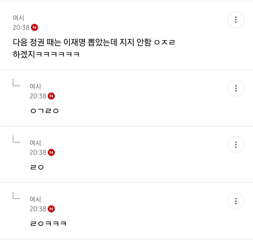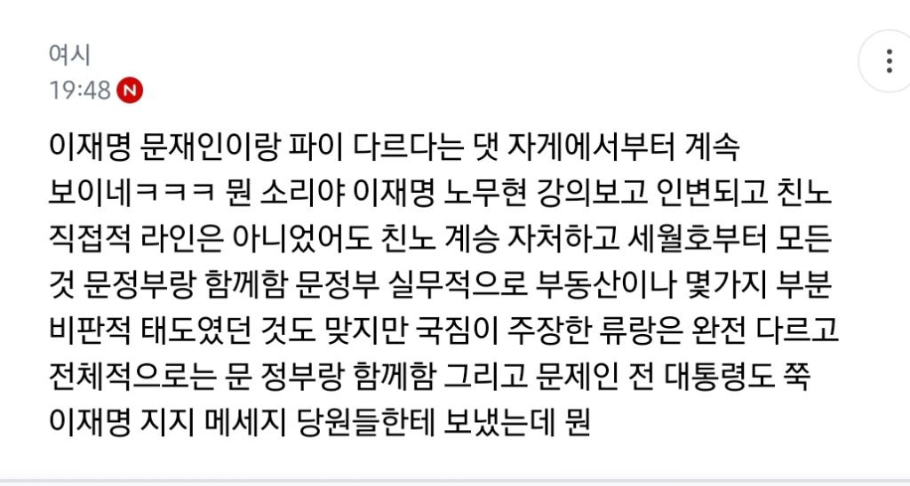 처음엔 글쓴 여시가 자기 생각 말한 것 뿐인데 입막한다 몰아간다는 식으로 쉴드치던 사람들(자분) 있잖아? 이 사람들이 원하던 진자 플 (문재인 까플이나 이재명 문재인 지지자 싸우는 플) 안 나오니까 자기들 스스로 ㅋㅋㅋㅋㅋㅋㅋㅋㅋㅋㅋㅋㅋㅋㅋ 나도 문재인 별로였지만... 이딴 댓글 달기 시작함