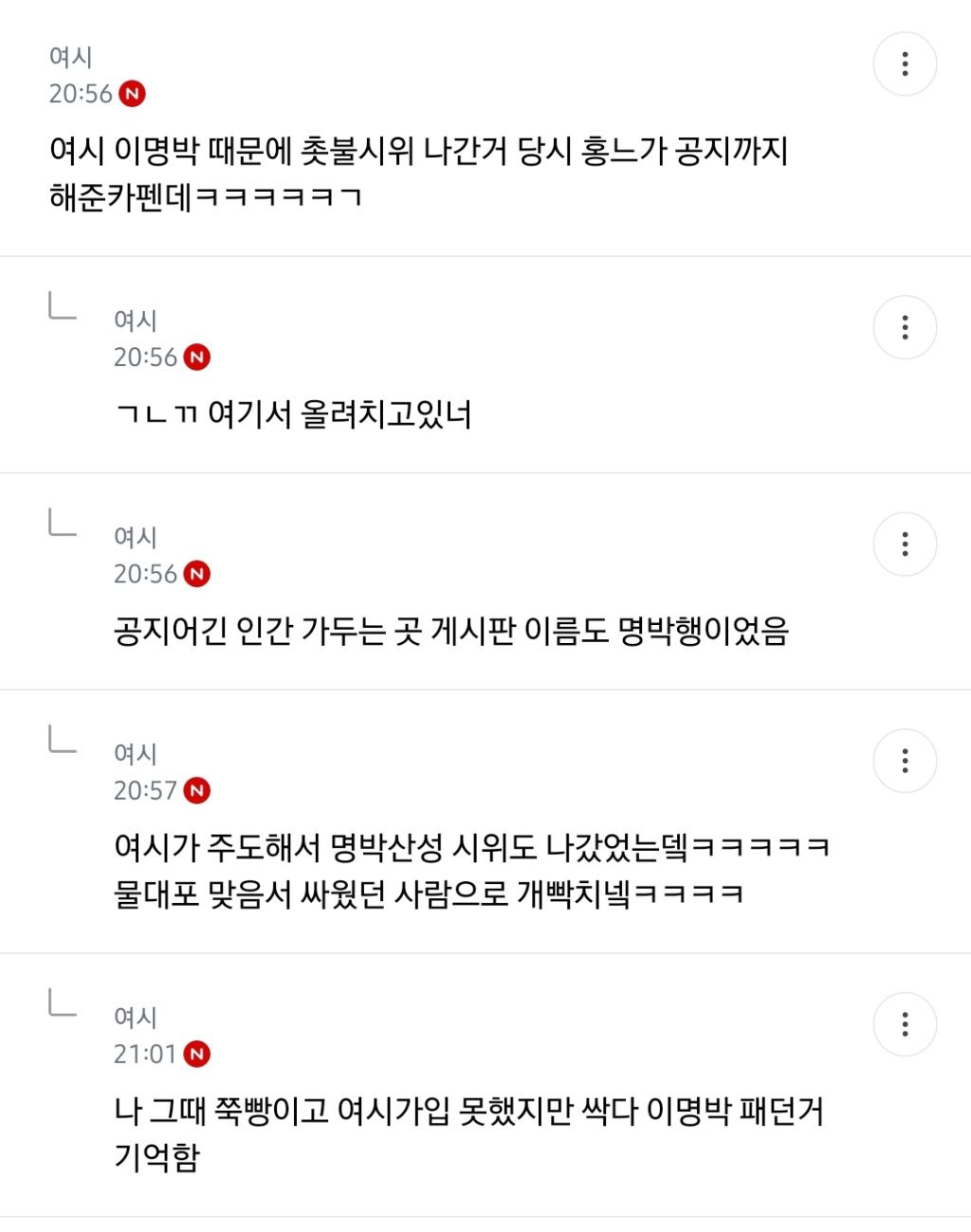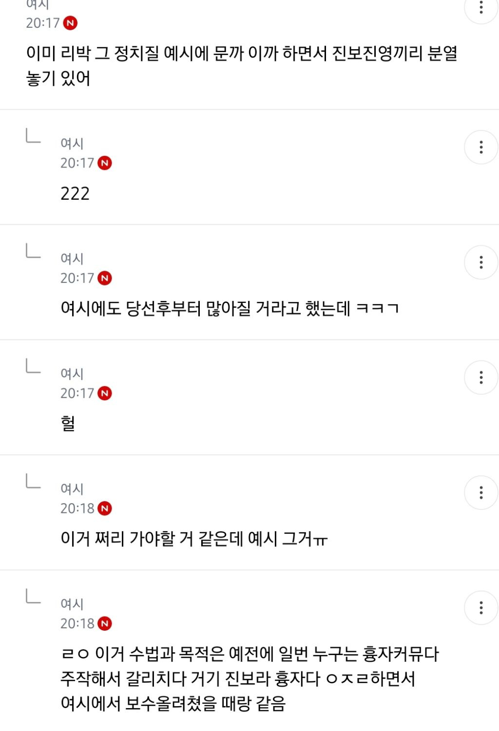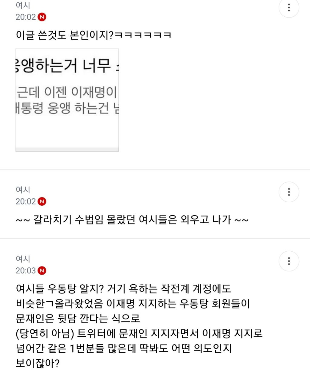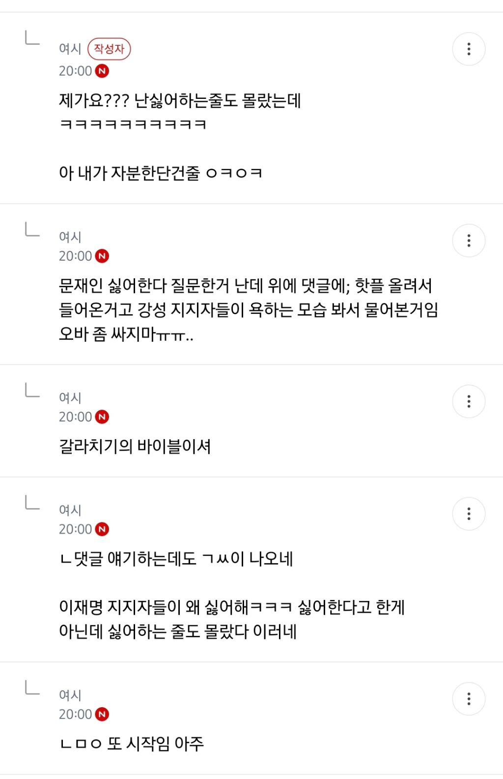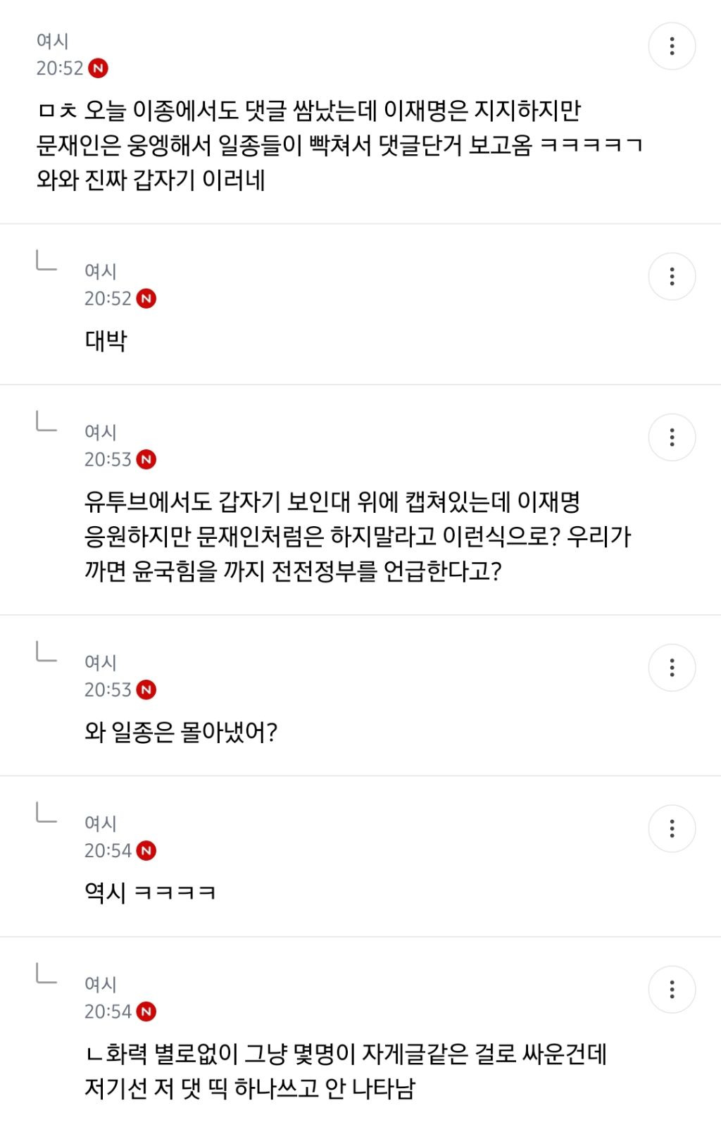 처음엔 글쓴 여시가 자기 생각 말한 것 뿐인데 입막한다 몰아간다는 식으로 쉴드치던 사람들(자분) 있잖아? 이 사람들이 원하던 진자 플 (문재인 까플이나 이재명 문재인 지지자 싸우는 플) 안 나오니까 자기들 스스로 ㅋㅋㅋㅋㅋㅋㅋㅋㅋㅋㅋㅋㅋㅋㅋ 나도 문재인 별로였지만... 이딴 댓글 달기 시작함