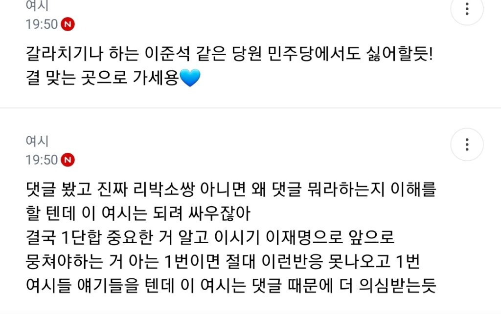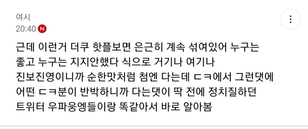 ㄱㅆ이 댓글로 엄청 싸우면서 자기 민주당원이라고 3년전 인증까지하는데 알디시피 리박들도 저런 인증 다 함 ㄱㅆ 개 수상했던 건 자기 편드는 척하면서 찐으로 까 유도하는 댓글들엔 아무 말 안하고 저런 거 설명해주고 눈치 챙기라는 사람들한테만 뭐라함