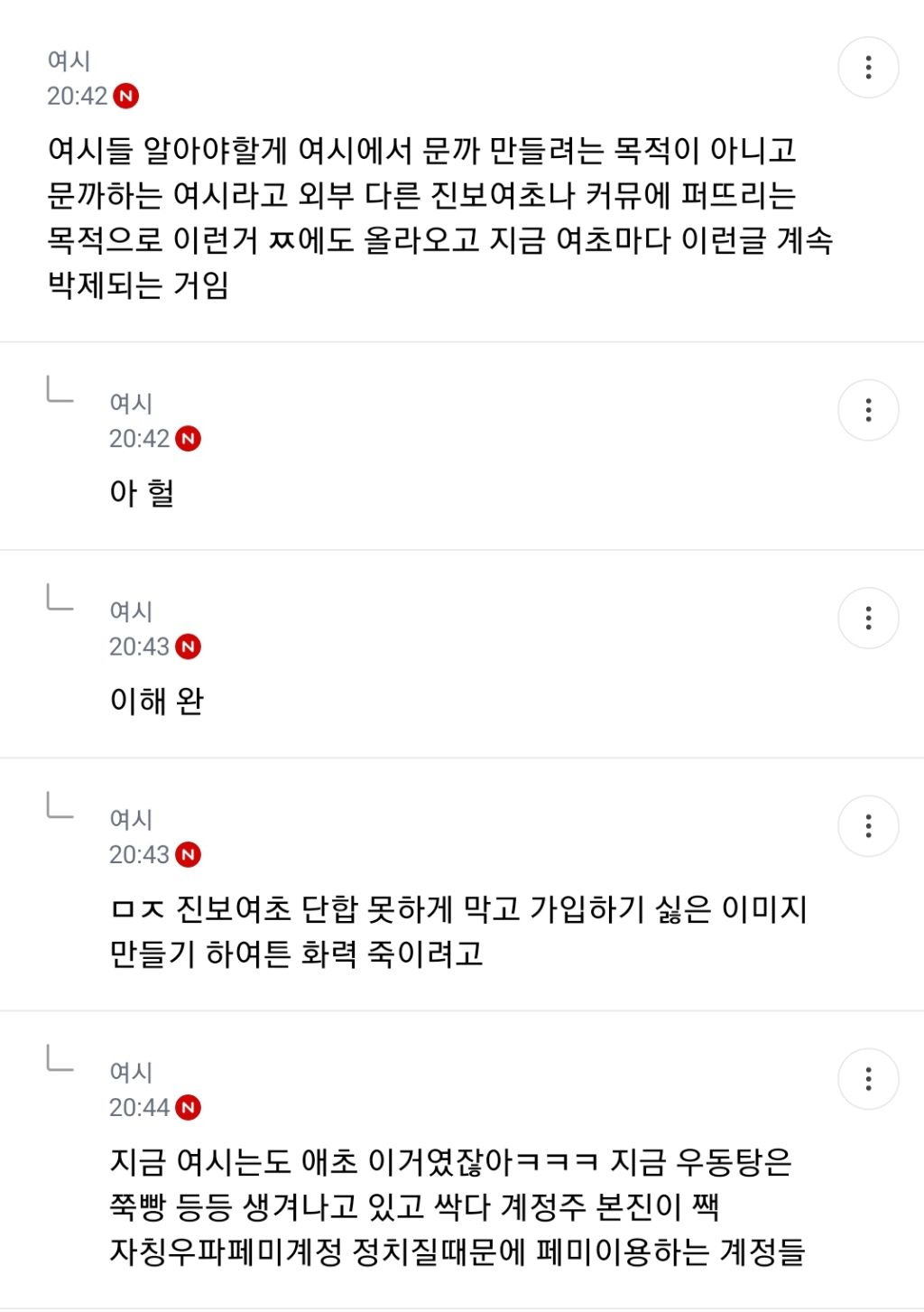 오늘자 대형 진보여초 (여시) 핫플 중 하난데 벌써 이런 글 여러개 올라옴