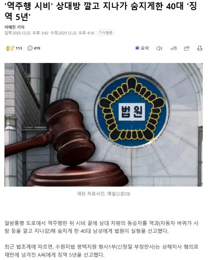 '역주행 시비' 상대방 깔고 지나가 숨지게한 40대 '징역 5년' |