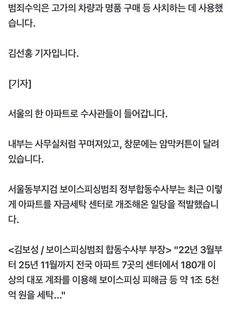아파트서 24시간 돈 세탁…1.5조 굴리며 호화생활![]() ![]() 합수부는 범죄단체 가입 등 혐의로 13명을 입건하고 이중 7명을 구속 상태로 재판에 넘겼습니다. 아직 잡히지 않은 40대 남성 총책 A씨 등 나머지 6명도 체포영장을 발부받아 추적 중입니다. A씨가 돈세탁으로 거둔 범죄수익은 126억에 달합니다. 합동수사부는 총책 A씨의 주거지와 은신처를 압수수색하고 재산을 추징보전하는 등 약 34억원의 범죄수익을 확보했습니다. 일당은 평균 6개월에 한번씩 거처를 옮기는 이른바 '아파트 널뛰기'를 하며 추적을 피해왔는데, 이웃 간 노출이 덜한 신축 아파트만 골라 옮겨다녔습니다. 센터를 옮길 때 흔적을 남기지 않는 치밀함도 보였습니다. <김보성 / 보이스피싱범죄 합동수사부 부장> "센터를 이전할 때마다 외장 하드를 제거하거나 대포 계좌 관리에 필요한 카드 등을 파기하고…" 하위 조직원이 수사망에 걸렸을 때를 대비해 "딜러 일을 했을 뿐"이라는 식의 대본도 미리 준비돼 있었습니다. 세탁 수수료 등 범죄수익은 수억원의 차량과 명품을 구매하는데 사용됐고, 카지노나 에너지 사업 등에 투자하려한 정황도 확인됐습니다. 합수부는 추가로 인적사항이 특정된 피의자 8명도 추적 중입니다. ㅡㅡㅡㅡㅡㅡ https://n.news.naver.com/article/422/0000825249 ㅡㅡㅡㅡㅡㅡ ㅅㅂ 1조 5천억 돈세탁했다는건 보이스피싱 피해금액이 1조5천억이라는건가? |