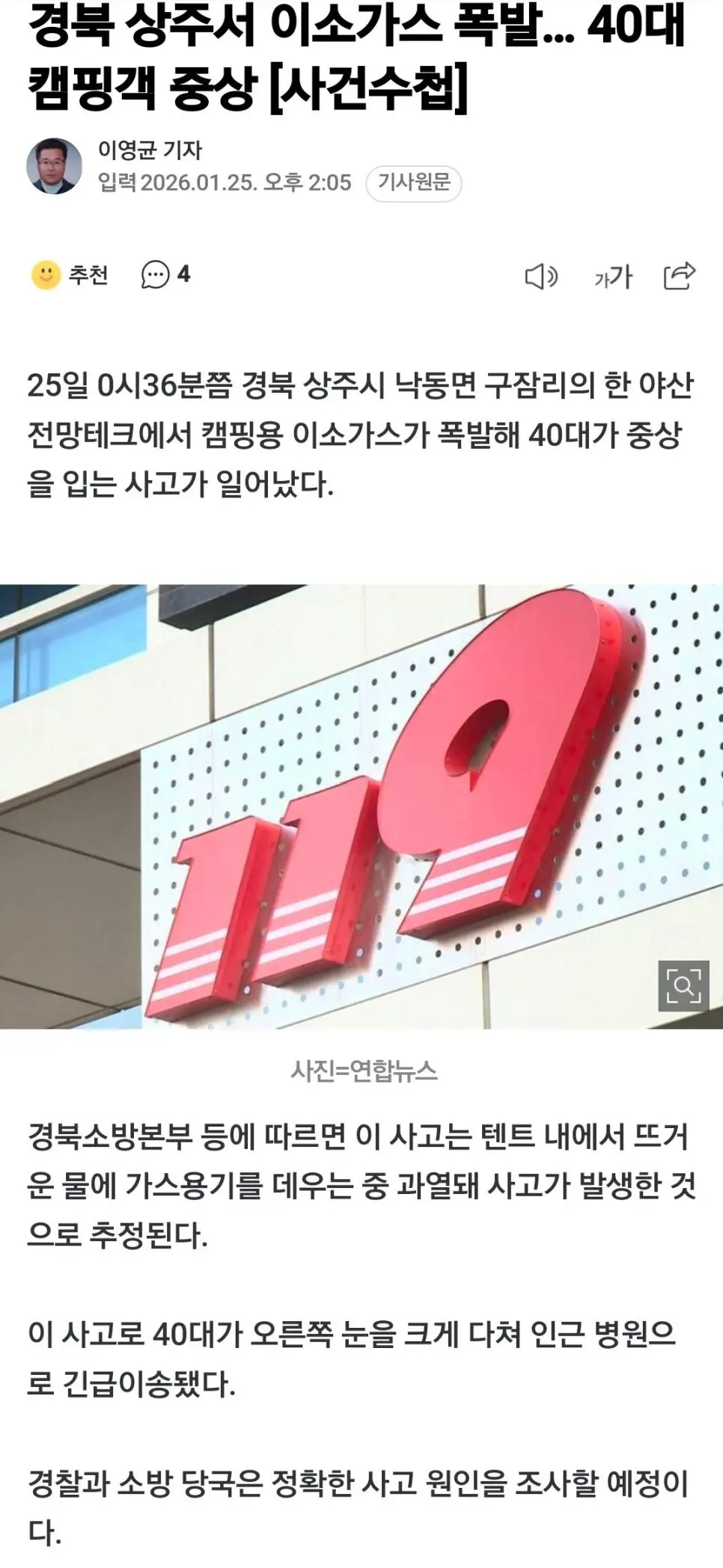 경북 상주서 이소가스 폭발… 40대 캠핑객 중상 [사건수첩] |