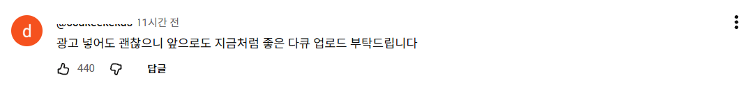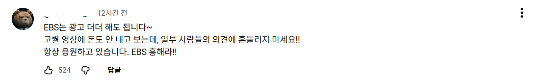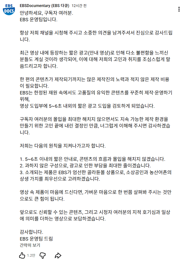 오늘자 EBS 다큐 운영팀이 유튜브 채널에 올린 공지![]() 재정 사정 때문에 5~6초짜리 광고 넣게된 점 양해바란다고 함 광고되는 제품은 소상공인하고 농산어촌을 우선적으로 고려하겠다고 함 ![]() ![]() ![]() ![]() ![]() 다들 호의적임 |